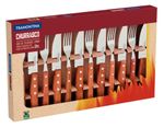 Jogo de Talheres Jumbo para Churrasco Tramontina com Lâminas em Aço Inox e Cabos em Madeira Natural 12 Peças Com o Jogo de Talheres Jumbo para Churrasco Tramontina com Lâminas em Aço Inox e Cabos em Madeira Natural 12 Peças, você terá os itens perfeitos para saborear aquele churrasco em família! Eles combinam com qualquer ambiente e ainda deixam a hora da refeição mais bonita e charmosa, pois os cabos são produzidos em madeira natural com acabamento polido. As lâminas são em aço inox e contam com um fio de alta durabilidade devido ao tratamento térmico a que foram submetidas. Garanta o seu jogo e deixe seu churrasco ainda mais especial e completo! Informações Gerais: Lâminas de aço inox. As lâminas das facas têm maior durabilidade do fio devido ao tratamento térmico. As lâminas dos garfos conta com maior espessura e uma estampagem do aço que garante maior resistência, evitando deformações. Os cabos são de madeira natural. Rebites de alumínio. Uso seguro e adequado: Antes da primeira utilização, lave bem as peças e seque-as. Tenha cuidado ao manusear produtos cortantes e perfurantes e mantenha-os fora do alcance de crianças. Para maior durabilidade dos produtos, recomenda-se secar bem antes de guardar.Para descarte dos produtos e embalagens siga as orientações de reciclagem vigentes. Garantia: 90 dias de garantia legal para vícios ou defeitos de fabricação.
