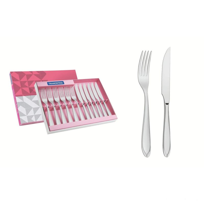 Jogo Churrasco Tramontina Laguna Aço Inox 12 Peças Tramontina - Jogo para Churrasco Tramontina Laguna em Aço Inox 12 Peças O Jogo para Churrasco Tramontina em Aço Inox 12 Peças da Linha Laguna vai transformar os encontros em volta da churrasqueira. São 12 peças projetadas para tornar esse momento ainda mais especial. Totalmente produzidas em aço inox, os garfos e facas apresentam características que dão mais conforto e facilidade ao uso. Além disso, as facas apresentam característica de temperabilidade, garantindo maior resistência à corrosão e durabilidade ao fio de corte. Elas ainda não riscam as porcelanas! São talheres práticos e de muito bom gosto, apresentando detalhes no cabo que embelezam na hora de servir. São ainda fáceis de lavar, podendo ir à máquina de lavar louças diariamente. Peças totalmente feitas de aço inox, altamente duráveis, mantêm suas características originais, preservando a beleza, a higiene e a durabilidade do material. Garfos com dentes polidos na parte interna, com formato apropriado para a boca e bordas arredondadas para proporcionar maior conforto no uso. Facas totalmente temperadas, que garantem maior durabilidade no fio de corte e maior resistência à corrosão, e por suas características de temperabilidade, não riscam as porcelanas. Acabamento em brilho, com detalhes no cabo. Próprias para uso diário combinam com qualquer ambiente. Podem ser lavadas diariamente na máquina de lavar louças. Cuidados com o produto Durante a lavagem, use apenas sabão ou detergente e uma esponja macia. Outros tipos de produtos como palha de aço, poderão riscar ou prejudicar o brilho dos talheres. Enxágue bem cada peça a fim de remover totalmente os resíduos dos produtos de limpeza,pois, por serem abrasivos, podem prejudicar o inox. Sempre que possível, use água quente, pois renova o brilho do talher. Após a lavagem, enxugue imediatamente os talheres, caso contrário, as substâncias químicas da água (cloro) poderão causar manchas.Evite atrito entre os talheres durante o processo de lavagem e no armazenamento, para mantê-los sem riscos. Evite o contato das peças com superfícies quentes. Elas provocam a descoloração do produto. Não guarde os talheres em locais úmidos. A umidade também provoca manchas. Ao usar a lava-louça, recomendamos retirar os talheres logo que tenha terminado o ciclo ''enxaguar'', a fim de que sejam secados manualmente. Garantia 90 dias de garantia legal para vícios ou defeitos de fabricação. Características Gerais do Produto: Garantia: • 3 meses Contra defeitos de fabricação