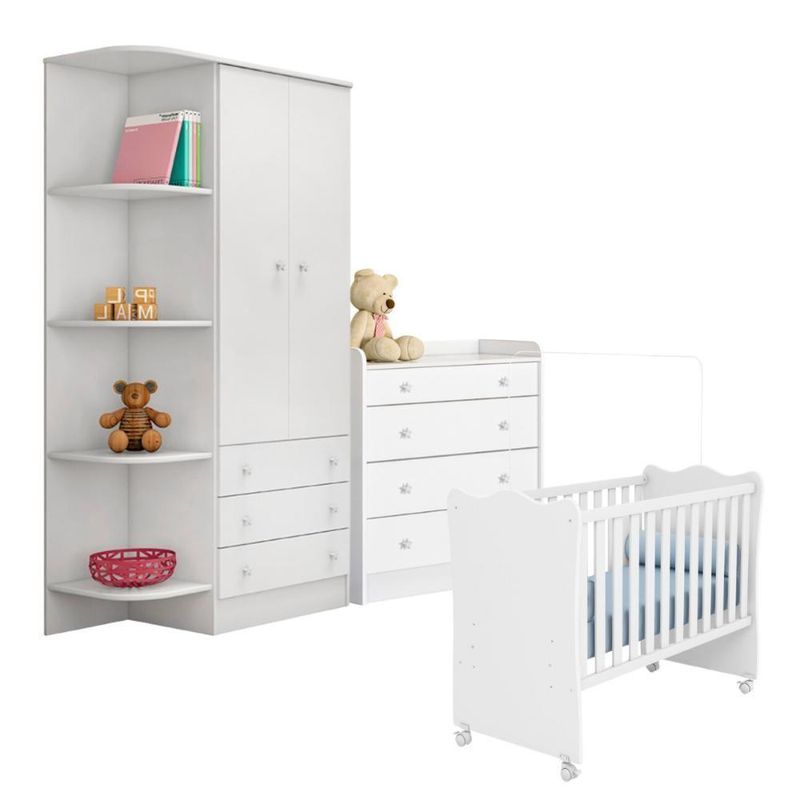 Jogo Completo Quarto De Bebê Arica Branco BrancoConjunto de quarto infantil completo é perfeito para você que procura praticidade e segurança na hora de montar o quarto do seu bebêA cômoda é feita em MDP 15/12mm, contém quatro gavetas com corrediças metálicas.O guarda roupa é feito em MDP 12/15mm,com 2 portas, 3 gavetas e 7 prateleiras.O berço é feito em MDP 15mm. Não acompanha colchão (comporta colchão de 10x130x60). Acompanha kit de rodízios para facilitar o manuseio do produtoInformações do Berço:Altura: 92,8 cmLargura: 68 cmComprimento: 133,5 cmInformações Adicionais:Material: MDP 15 mmPés em MDF de 25mmCor: BrancoEstrado Regulável em Quantas Alturas:3Peso suportado: 40 KgAcompanha colchão: Nãocomporta colchão de 10x130x601 Kit de rodízios 2 com trava e 2 semDimensões do Guarda Roupa:Altura: 185 cmLargura: 88,5 cmComprimento: 47,5 cmInformações do Guarda Roupa:Cor: BrancoGavetas: Sim (3)Cabideiro: Sim (1)Puxadores: Sim (8)Prateleiras: Sim (7)Portas: Sim (2)Material: MDPInformações da Cômoda:Altura: 94 cmLargura: 84 cmComprimento: 42,5 cmInformações da Cômoda:Cor: BrancoPossui Gavetas: Sim (4) Corrediças metálicasPuxadores: Sim (8) Estrela em PoliestirenoMaterial: MDP 15/12mmItens Inclusos:1 Cômoda1 Berço1 Guarda RoupaManual de MontagemKit completo para montagem e manual de instruçõesGarantia:3 meses contra defeito de fabricaçãoInformações Adicionais:- Fotos meramente ilustrativas do produto no ambiente.- Os objetos que ambientam as fotos não acompanham o produto;- Verificar descrição e tamanho do produto antes da compra.- Avaliar a mercadoria no ato do recebimento e recuse em caso de divergência ou .- Mantenha as informações de contato e endereço de atualizados para entrarmos em contato caso necessário.- Limpar com flanela ou pano macio seco, não utilizar produtos abrasivos, desengordurantes, álcool ou solvente. Não expor o produto diretamente à luz solar e à umidade.* Sugerimos a contratação de um montador para a montagem do produto. Não nos responsabilizamos por causadas no ato da montagem.* Não nos responsabilizamos pela montagem e desmontagem do produto no ato da e , assim como os custos gerados nestas situações.* A transportadora rá o produto no andar térreo do endereço de .* Não nos responsabilizamos por subir escadas, corredores e elevadores ou transporte por guincho em apartamento COR PREDOMINANTE: Branco | MATERIAL PRINCIPAL: MDP | GÊNERO (INFANTIL): Unissex | ALTURA DO PRODUTO COM EMBALAGEM (CM): 51 | LARGURA PRODUTO COM EMBALAGEM (CM): 74,5 | COMPRIMENTO PRODUTO COM EMBALAGEM (CM): 185,5 | PESO PRODUTO COM EMBALAGEM (KG): 108,2 | TEMPO DE (DIAS): 3 | PESO DO PRODUTO (KG): 108,2 | DESCRIÇÃO DO TAMANHO: 185x93x47,5 | CORES DO PRODUTO (FILTRO DE CORES): Branco | MATERIAL PARA FILTRO: MDP | ESTADO DE ORIGEM: PR | ALTURA DO PRODUTO (CM): 185 | LARGURA DO PRODUTO (CM): 93 | COMPRIMENTO DO PRODUTO (CM): 47,5 | CONTEÚDO DA EMBALAGEM: 1 Berço, 1 Kit Rodizios 1 Cômoda e 1 Guarda Roupa | INSTRUÇÕES/CUIDADOS: Limpar com flanela ou pano macio seco, não utilizar produtos abrasivos | PRODUTO PRECISA DE MONTAGEM?: Sugerimos a contratação de um montador para a montagem do produto. Não nos responsabilizamos por causadas no ato da montagem. | PRODUTO: Berço, Cômoda e Guarda Roupa