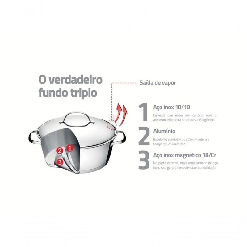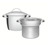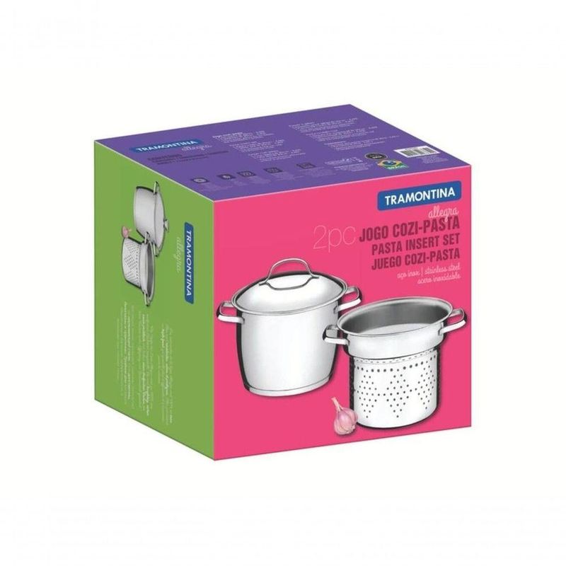 Jogo Cozi-pasta Tramontina Allegra Em Aço Inox 2 PeçasA Tramontina usa a mais alta tecnologia para produzir panelas de aço inox com fundo triplo. São duas camadas de aço inox envolvendo uma camada de alumínio. Dessa forma, o calor da chama se distribui por igual, deixando os alimentos muito mais macios e saborosos. Além disso a comida cozinha muito mais rápido, o que acaba gerando economia.Recomendações de Uso:Antes do uso: Antes de utilizar o , remova as eventuais etiquetas e lave-o com água quente e de uso: Use uma fonte de calor brando para evitar que o alimento grude no fundo da caçarola. O fundo triplo distribui uniformemente o calor, não sendo necessário o fogo alto. E, além disso, você economiza energia. Quando a caçarola for utilizada no fogão a gás, a chama não deve ultrapassar a base da caçarola. No caso de uso de chapa elétrica, a chapa deverá ter diâmetro igual ou inferior ao da caçarola. Sempre dissolva o sal em água fervendo ou com os alimentos, mexendo os ingredientes no início do cozimento. Não aqueça o alimento colocando uma caçarola do mesmo diâmetro sobre a outra. Esse procedimento é perigoso, pois cria vácuo e impossibilita a retirada do mesmo. Alguns alimentos que possuem amido, como massa e arroz, poderão deixar manchas na parte interna da caçarola durante o ós o uso: Para remover facilmente as manchas, passe um pano umedecido com suco de limão ou vinagre, Evite deixar alimento na caçarola por muito tempo o sal também pode provocar manchas. Para que a caçarola de aço inox fique sempre bonita e com brilho, recomendamos que seja lavada somente com detergente e esponja. A Tramontina desenvolveu uma pasta especial para polir e remover manchas nos produtos de aço inoxidável, que está disponível nos principais pontos de venda. (94537000)Depois da lavagem, sempre que possível, enxágue a caçarola com água quente e seque-a imediatamente, para que ela mantenha o brilho , pois o cloro e as substâncias contidas na água podem deixar manchas na caçarola. Não deixe a caçarola vazia sobre uma fonte de calor. Deixe as caçarolas quentes somente em superfícies resistentes ao calor.- Foto meramente ilustrativa- Embalagem litografadaInformações Adicionais:- Totalmente feitos em aço inox, por isso não solta nenhum resíduo nos alimentos, mantendo-os saudáveis. - Altamente duráveis, mantêm as características , preservando a beleza, a higiene e a durabilidade do material. - O fundo triplo (aço inox + alumínio + aço inox) distribui o calor uniformemente, proporcionando um cozimento mais rápido e uniforme, economizando energia e deixando os alimentos aquecidos por mais tempo. - Possuem design diferenciado e moderno, com acabamento em alto brilho. - Desenho limpo e sem cantos torna a limpeza mais fácil. - Possui tampa com saída de vapor e com encaixe perfeito.- Pode ser lavada diariamente Na máquina de lavar louça.- O caldeirão pode ser utilizado nos seguintes fogões: por indução, gás, elétrico e vitro-cerâmico.