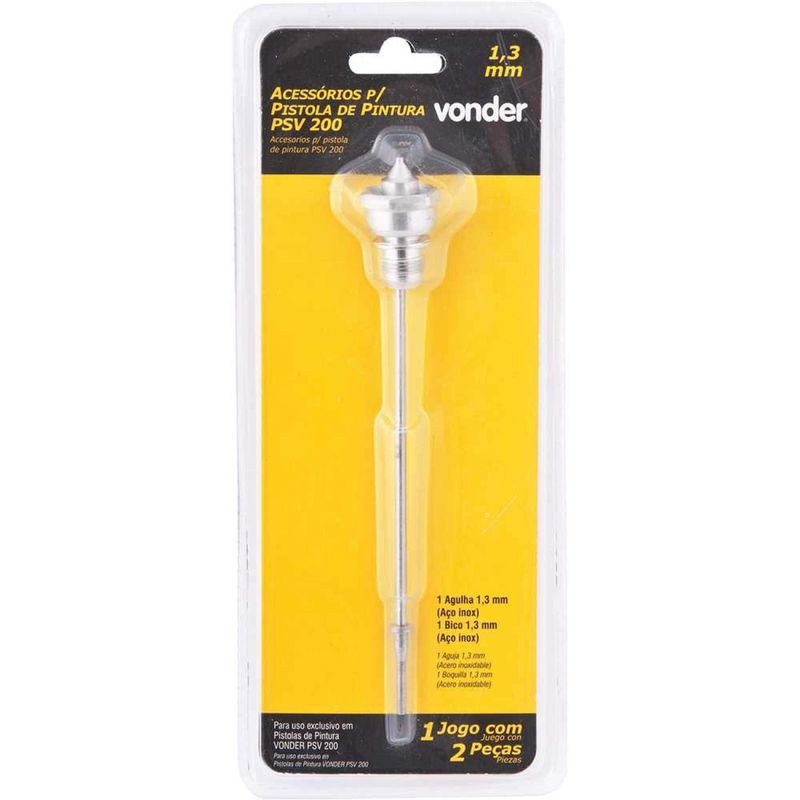 Jogo de Agulha e Bico de 1,3 mm Para Pistola de Pintura Modelo PSV 200, Vonder - Conteúdo da embalagem: 1 Agulha de 1,3 mm e 1 bico de 1,3 mm. Aplicação: Indicado para uso exclusivo na pistola de pintura modelo PSV 200 VONDER. Destaques: Peças originais proporcionam melhor desempenho do equipamento e garantem qualidade na aplicação de tinta. Referência: 6220200204 Garantia - E (CDC): Garantia legal: 90 dias Massa aproximada (peso): 0,058 kg Modelo da pistola: PSV 200 Diâmetro do bico: 1,3 mm Destaques Comercial: Peças originais proporcionam melhor desempenho do equipamento e garantem qualidade na aplicação de tinta. Aplicação Comercial: Indicado para uso exclusivo na pistola de pintura modelo PSV 200 VONDER. Características Gerais do Produto: Garantia: • 3 Meses