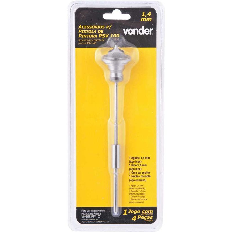Jogo de Agulha e Bico de 1,4 mm, Núcleo da Mola e Guia da Agulha Para Pistola de Pintura Modelo PSV 100, Vonder - Conteúdo da embalagem: 1 Agulha de 1,4 mm, 1 bico de 1,4 mm, 1 núcleo da mola e 1 guia da agulha. Aplicação: Indicado para uso exclusivo na pistola de pintura modelo PSV 100 VONDER. Destaques: Peças originais proporcionam melhor desempenho do equipamento e garantem qualidade na aplicação de tinta. Referência: 6220200102 Garantia - E (CDC): Garantia legal: 90 dias Massa aproximada (peso): 0,08 kg Modelo da pistola: PSV 100 Diâmetro do bico: 1,4 mm Destaques Comercial: Peças originais proporcionam melhor desempenho do equipamento e garantem qualidade na aplicação de tinta. Aplicação Comercial: Indicado para uso exclusivo na pistola de pintura modelo PSV 100 VONDER. Características Gerais do Produto: Garantia: • 3 Meses