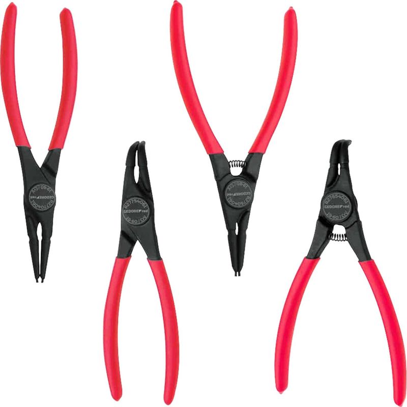Jogo de Alicates Para Anéis Internos e Externos, com 4 Peças, R28002104 Gedore RED OstenVonder - Conteúdo da embalagem: 1 Jogo de alicates para anéis, composto por 4 peças, sendo: 1 alicate para anéis externos ponta reta, 1 alicate para anéis externos ponta curva 90°, 1 alicate para anéis internos ponta reta e 1 alicate para anéis internos ponta curva 90°. Aplicação: Indicado para retirar e colocar anéis de retenção internos e externos. Destaques: Produzido em aço cromo vanádio, proporcionando maior resistência e durabilidade. Referência: 3301829 Garantia - E (CDC): Garantia legal: 90 dias Massa aproximada (peso): 0,8 kg Tipo do cabo do alicate.: Cabo plastificado Material do corpo do alicate: Aço cromo vanádio Acabamento: Escurecido Tamanho: 7" Destaques Comercial: Produzido em aço cromo vanádio, proporcionando maior resistência e durabilidade. Aplicação Comercial: Indicado para retirar e colocar anéis de retenção internos e externos. Características Gerais do Produto: Garantia: • 3 Meses