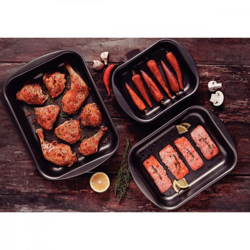 Jogo de Assadeiras Tramontina Brasil Grafite em Alumínio com Revestimento Antiaderente 3 Peças <br><br> Tenha uma cozinha bem equipada para preparar as melhores receitas! Com o Jogo de Assadeiras Tramontina Brasil Grafite em Alumínio com Revestimento Antiaderente 3 Peças você vai possuir produtos versáteis e práticos para preparar inúmeras receitas. Na cor grafite, as três peças são produzidas com materiais de qualidade. Em alumínio, possuem revestimento interno e externo antiaderente Starflon Max, material que possibilita uma cozimento mais uniforme e evita que os alimentos grudem. Além disso, são fáceis de limpar, podendo ir à máquina de lavar louças. Versáteis, podem ser utilizadas em fornos a gás e elétricos. Um jogo indispensável para você! <br><br> Corpos de alumínio com espessura que proporcionam cozimento rápido e uniforme. <br>Revestimento interno e externo de antiaderente Starflon Max que não gruda, é fácil de limpar, mais durável e não é prejudicial à saúde. <br>Podem ir à máquina de lavar louças facilitando seu dia a dia.