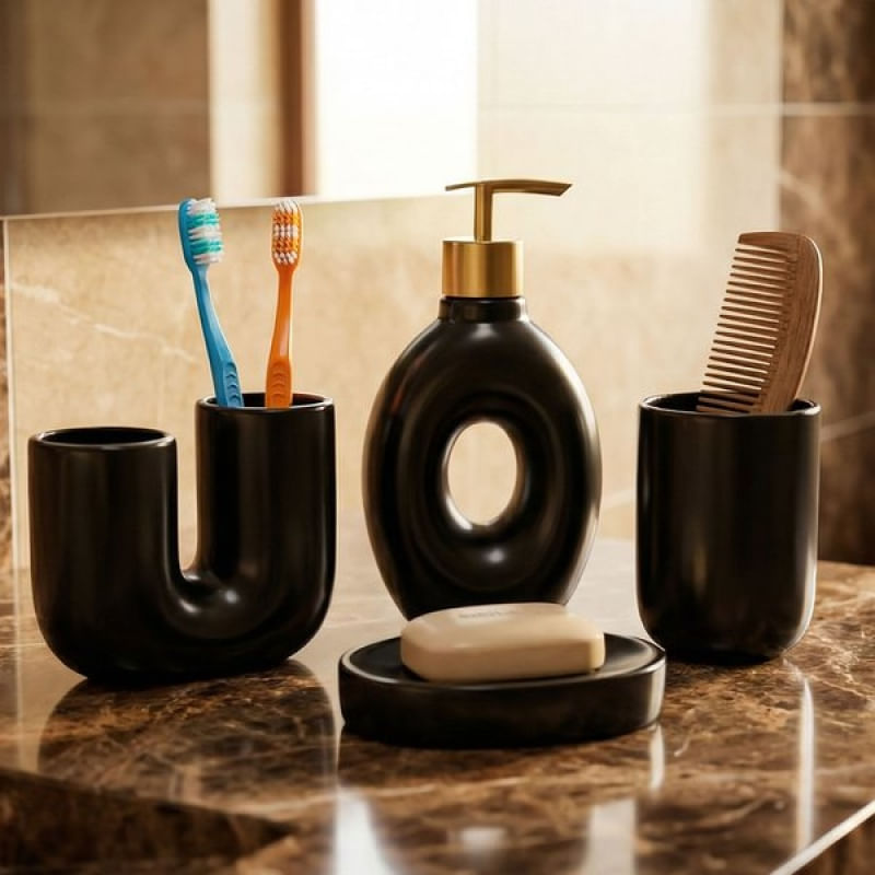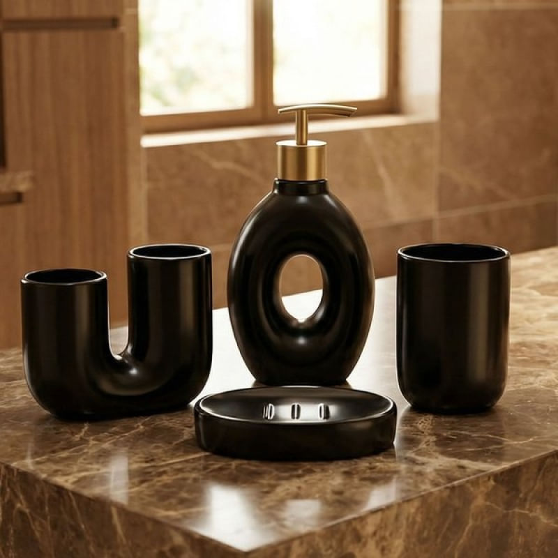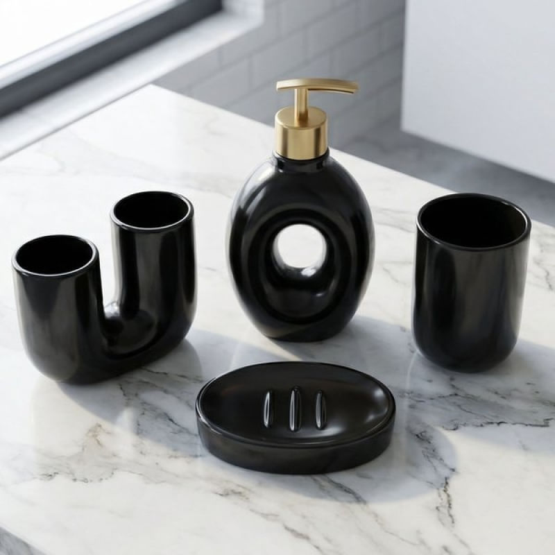 Jogo De Banheiro Acessórios Lavabo Elegante Preto Kit 4pçs - Relógio quartz decorativo Com design moderno e acabamento premium, Ideal para organizar e decorar seu lavabo com estilo! Detalhes do produto: Material Em Cerâmica 1 Copo Multiuso - 300ml / Altura 10cm x Diâmetro 7cm 1 Porta Escovas - Altura 10cm x Largura 12cm 1 Saboneteira Liquida - 300 ml / Altura 19cm x Largura 10cm 1 Saboneteira - Largura 12cm x Comprimento 8cm Conteúdo da embalagem: 1x Kit de banheiro com textura em arcos 4pçs preto Características Gerais do Produto: • Material: Cerâmica • Modelo: Jogo de Banheiro • Cor: Preto Garantia: • Garantia contra avarias no transporte