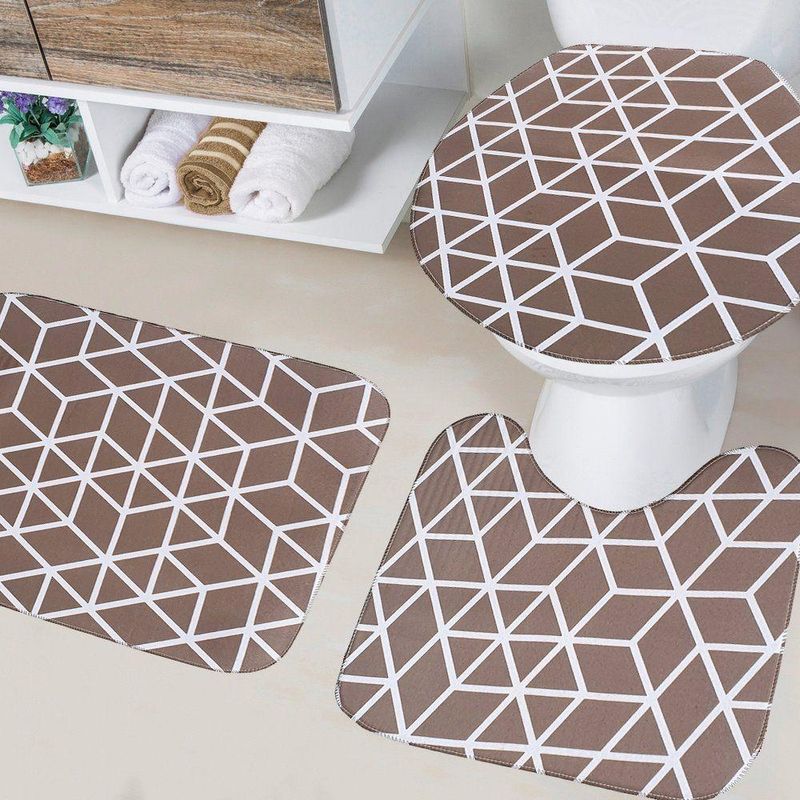 Jogo De Banheiro Creative 03 Peças Com Base Antiderrapante 100% Poliéster - Losango BegeO Jogo de Banheiro Creative é a combinação perfeita de modernidade e segurança para o seu lar. Com estampas contemporâneas e uma superfície macia, este kit transforma o visual do seu banheiro, oferecendo um toque de sofisticação e o máximo de conforto para o seu pós-banho.Por que escolher este produto?- Estampas Modernas: O design geométrico em Losango Bege traz um ar atual e elegante, combinando facilmente com diversos estilos de cubas e revestimentos.- Segurança e Estabilidade: Equipado com base antiderrapante em látex, que garante aderência firme ao piso, evitando deslizes mesmo em ambientes úmidos.- Toque Macio e Durável: A superfície 100% poliéster proporciona uma sensação agradável aos pés, além de ser resistente e de fácil manutenção.Produto composto por (Total 03 Peças):- 01 Tapete para Pia 60cm x 40cm- 01 Tapete para Vaso 44cm x 40cm- 01 Tampa para Vaso 45cm x 40cmEspecificações Técnicas:- Superfície: 100% Poliéster- Base: Antiderrapante em Látex- Estampa: Losango Bege