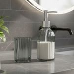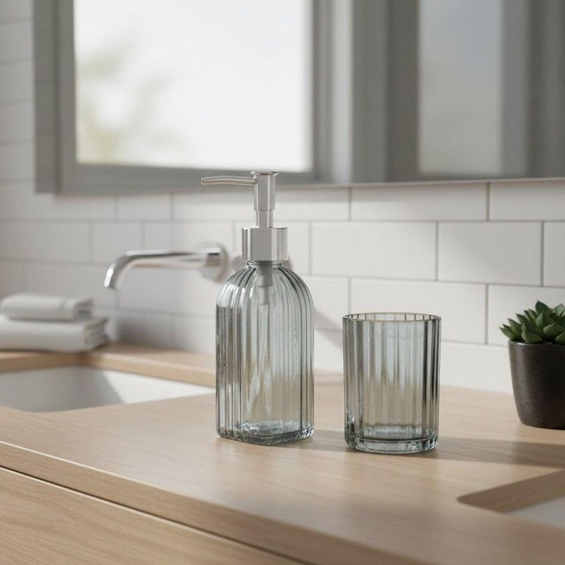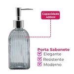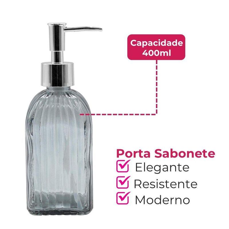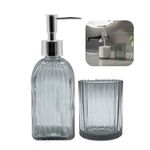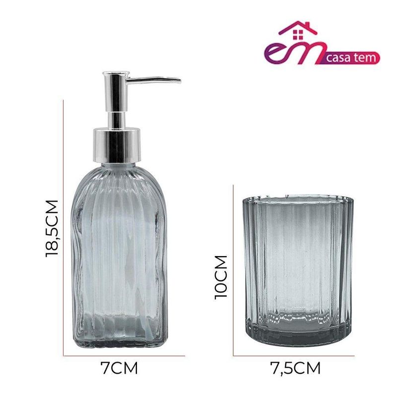 Jogo De Banheiro Kit 2 Peças Copo Pote Organizador E Porta Sabonete Vidro Cinza Em Casa TemJogo de Banheiro Kit 2 Peças Copo Pote Organizador e Porta Sabonete Vidro Cinza Em Casa TemOrganiza e dispensa itens de higiene pessoal, como sabonete líquido e acessórios, por meio de um conjunto de duas peças fabricadas em vidro na tonalidade cinza. O material de vidro contribui para a higiene, pois não absorve odores, não reage com os produtos e facilita a limpeza e manutenção, auxiliando na conservação dos itens armazenados.O porta sabonete líquido possui capacidade de 400ml, o que permite o uso contínuo sem a necessidade de reabastecimento frequente. Seu sistema de dosagem atua para dispensar a quantidade necessária, contribuindo para o controle do consumo. O pote organizador, com 300ml de capacidade, é adequado para armazenar escovas de dente, algodão ou outros pequenos objetos, mantendo a bancada organizada e os itens protegidos. Ambos os componentes possuem base estável, o que oferece segurança ao manusear em superfícies de banheiro.Medidas da caixa: 8,5 x 17 x 20 cmPorta Sabonete Líquido: 7 x 7 x 19 cm - 400mlPote Organizador: 8 x 8 x 10 cm - 300mlCódigo: 128127Referência: 16825Marca: EmCasaTemTamanho: 400ml / 300mlCapacidade: 700mlPeso: 900gCor: Cinza, TransparenteMaterial: VidroDimensões do produto (AxLxC): 8,50x17,00x20,00cmConteúdo da embalagem: 1 Caixa Litografada, 1 Porta Sabonete Líquido, 1 Pote Organizador