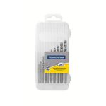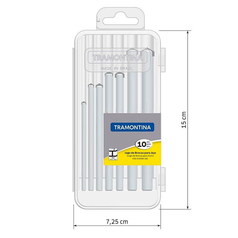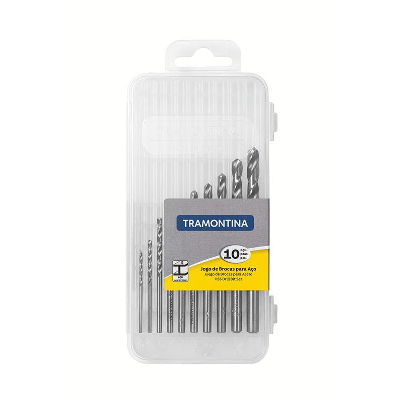 Perfuração precisa e eficiente em açoO Jogo de Brocas HSS em Polegadas para Aço Tramontina DIN 338 é ideal para quem busca eficiência e resistência em trabalhos com metais. Composto por 10 brocas de diferentes medidas, variando de 1/16" a 1/4", ele garante versatilidade para diferentes aplicações. Produzidas em aço rápido HSS, essas brocas oferecem alto desempenho na perfuração de aço, com corte preciso e durabilidade prolongada, sendo perfeitas tanto para uso profissional quanto doméstico.Qualidade testada e confiávelCada broca passa por rigorosos testes de aplicação prática, assegurando excelente resistência mecânica mesmo em usos intensos. Fabricadas conforme as normas DIN 338, as ferramentas garantem confiabilidade e segurança durante o uso. Seja em oficinas, indústrias ou projetos de manutenção, o jogo de brocas da Tramontina é uma escolha confiável para perfurações com qualidade e precisão.