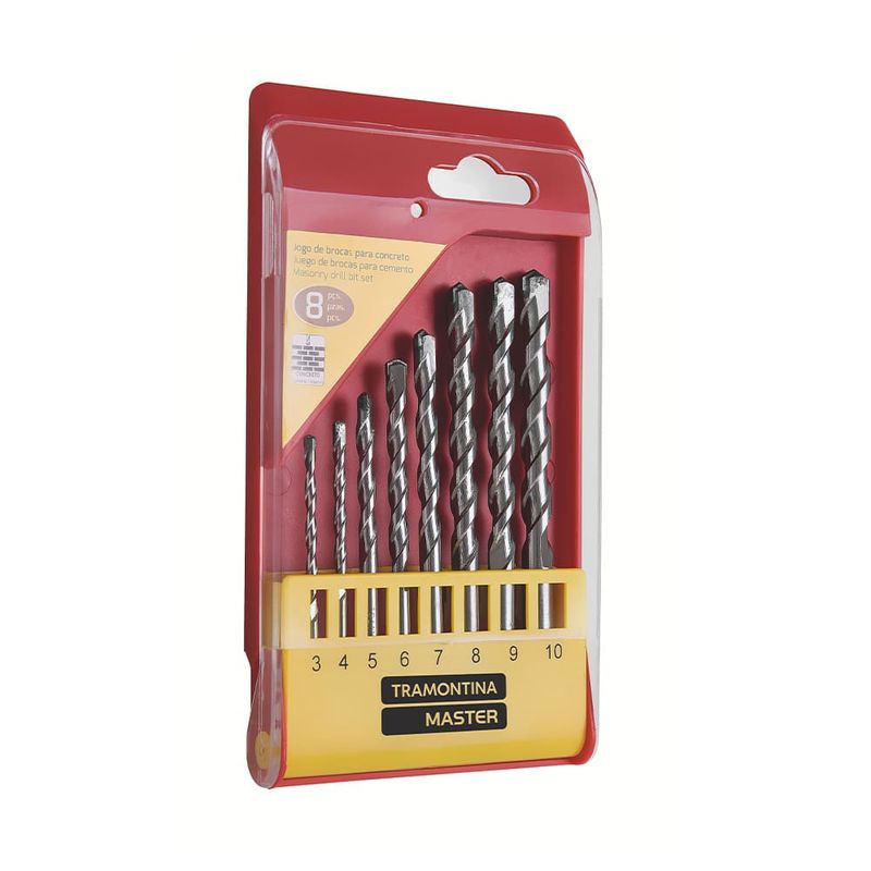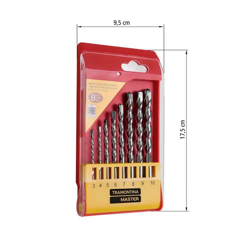 Precisão e desempenho em perfurações no concreto Levando mais durabilidade e resistência para os trabalhos com concreto, o Jogo de Brocas para Concreto Tramontina Master 8 Peças é ideal para quem busca precisão nos projetos. Desenvolvidas especialmente para perfuração em concreto, essas brocas são perfeitas para garantir um resultado eficaz e seguro.Versatilidade com 8 tamanhos diferentesAs brocas devem ser utilizadas com furadeiras de impacto no modo martelete, o que assegura maior eficiência durante o uso. O conjunto conta com oito tamanhos distintos — 3, 4, 5, 6, 7, 8, 9 e 10 mm — oferecendo versatilidade para diferentes aplicações e necessidades.
