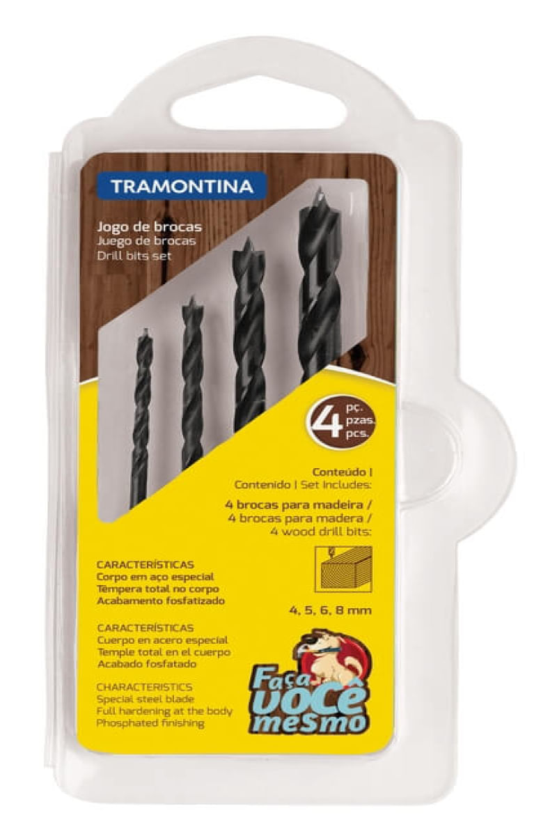 Corpo em aço especial. Têmpera total no corpo. Acabamento fosfatizado. As ferramentas são submetidas a testes de aplicação prática para garantir sua resistência mecânica em uso intenso. Utilizada em trabalhos de perfuração em madeira As ferramentas são produzidas e testadas conforme normas específicas. Conteúdo: 4 brocas de 4, 5 6 e 8 mm.Garantia do produto: 90 dias de garantia de acordo com o Código de Defesa do Consumidor + a Garantia do Fabricante