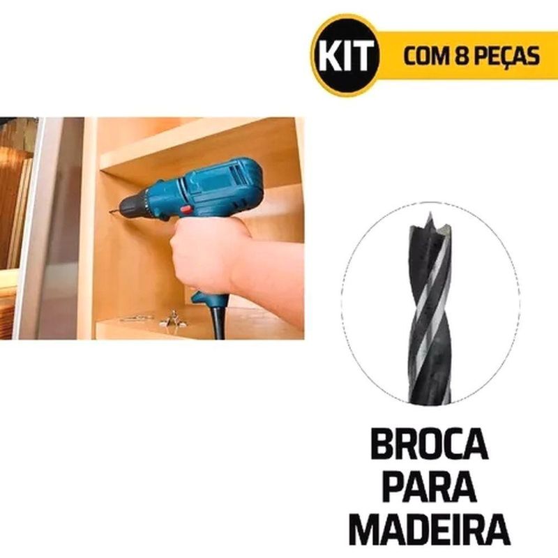 Jogo De Brocas Para Madeira Com 8 Peças De 03mm A 10mmJogo de Brocas para Madeira com 8 Peças de 03mm a 10mm=====================================Escolha perfeita para quem busca precisão, durabilidade e versatilidade em trabalhos com madeira.Ideal tanto para profissionais quanto para entusiastas de bricolagem, este conjunto inclui 8 brocas com diâmetros variados, permitindo a realização de furos limpos e precisos em diferentes tipos de madeira.Ideal para projetos de marcenaria, carpintaria e bricolagem, as brocas oferecem excelente resistência ao desgaste e alta durabilidade, as pontas possuem um design em espiral com centro pontiagudo, garantindo perfurações precisas, evitando deslizamentos e facilitando o início do furo.=====================================Contém: 08 Brocas (sendo 03mm / 04mm / 05mm / 06mm / 07mm / 08mm / 09mm / 10mm)Especificações:- Material: Aço Carbono Tratado- Alta Durabilidade- Resistente ao Desgaste=====================================Devido à diferença entre monitores e iluminação diferentes, pode haver variação na tonalidade apresentada no anúncio. Medidas muito aproximadas.Jogo de Brocas para Madeira com 8 Peças de 03mm a 10mm=====================================Escolha perfeita para quem busca precisão, durabilidade e versatilidade em trabalhos com madeira.Ideal tanto para profissionais quanto para entusiastas de bricolagem, este conjunto inclui 8 brocas com diâmetros variados, permitindo a realização de furos limpos e precisos em diferentes tipos de madeira.Ideal para projetos de marcenaria, carpintaria e bricolagem, as brocas oferecem excelente resistência ao desgaste e alta durabilidade, as pontas possuem um design em espiral com centro pontiagudo, garantindo perfurações precisas, evitando deslizamentos e facilitando o início do furo.=====================================Contém: 08 Brocas (sendo 03mm / 04mm / 05mm / 06mm / 07mm / 08mm / 09mm / 10mm)Especificações:- Material: Aço Carbono Tratado- Alta Durabilidade- Resistente ao Desgaste=====================================Devido à diferença entre monitores e iluminação diferentes, pode haver variação na tonalidade apresentada no anúncio. Medidas muito aproximadas.