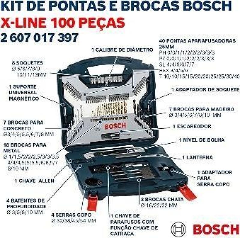 O Jogo de Brocas X-Line com 100 peças conta com peças feitas em material resistente, oferecendo maior durabilidade, as peças são acondicionadas em maleta plástica, permitindo organização e praticidade. Indicado para operações diversas com madeira, metal e concreto. 1 adaptador magnético universal 1 adaptador de soquete 1 adaptador para serra copo 1 chave de catraca angular 1 chave Allen 1 nível de bolha 1 guia para broca 1 lanterna 1 limitador de profundidade 18 brocas para metal de titânio 1-10 mm 7 brocas para concreto 3-8 mm 7 brocas para madeira 3-10 mm 3 brocas chatas titânio 16/22/32 mm 40 pontas 25 mm SL/HEX/PH/PZ/Torx 8 soquetes 6/7/8/9/10/11/13 mm 4 limitadores de profundidade 3/5/8/10 mm e 4 serras copo 32/38/45/54 mm. Ideal para marceneiros e hobbystas!