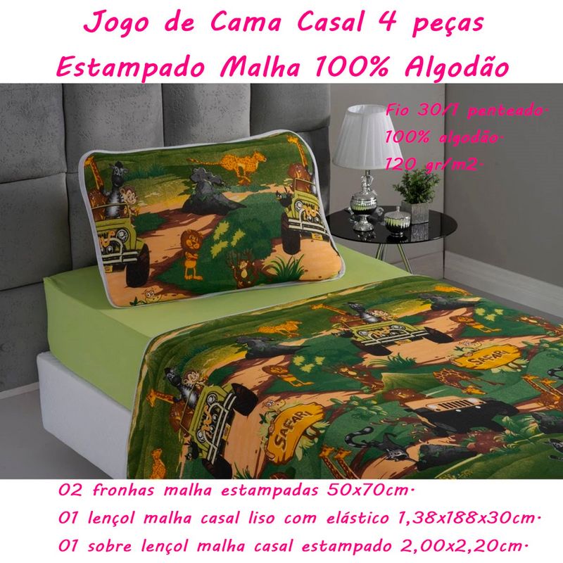 Chegou na KazzaVip o Jogo de Cama 4 Peças Estampado da Linha Kids Vivaldi, é muito versátil, pois você pode usar o conjunto ou as peças separadas, pode usar a fronha sobre qualquer lençol ou até como uma decoração para a cama, o lençol com elástico é liso e se torna uma peça coringa para sua casa. É um produto de alta qualidade, durável e resistente. Você irá se surpreender com a qualidade e a beleza desse jogo de cama.Jogo de Cama KazzaVip Casal Malha Estampado 100% Algodão Safari Divertido 4 peças Kids VerdeTodas as informações divulgadas são de responsabilidade do fabricante/fornecedor.Marca: VivaldiClassificação: CasalTecido: MalhaComposição (Fios): 100% Algodão - Fio 30/1 - PenteadoGramatura: 120g/m2Conteúdo e Medidas: Jogo de Cama Malha Estampado - Safari Divertido - 04 Peças01 - Lençol Malha com Elástico Liso (1,38m x 1,88m x 30cm)01 - Sobre lençol Malha Estampado( 2,00m x 2,20m )02 - Fronha Malha Estampada c/ Viés (50cm x 70cm)Coleção / Sortimento: KidsMais Pratico - Elástico Contorna todo o LençolEstampado: SimCor: VerdeFabricante: Sul BrasilReferencia: 3446Código de Barras: 7899595896227Garantia(Fabricante): Contra Defeito de FabricaçãoObservação: Informações Sujeitas a Alterações sem Aviso Prévio.Imagens Meramente IlustrativasINFORMAÇÕES IMPORTANTES: Item composto apenas por 01 Lençol,01 Sobre lençol Estampado e 02 Fronhas Estampadas, os demais itens são meramente decorativos e NÃO fazem parte do conteúdo da embalagem.Aviso : - Todas as medidas são valores aproximados e podem sofrer alguma variação.- As cores podem sofrer uma pequena variação, dependendo do lote do produto e das configurações do seu computador