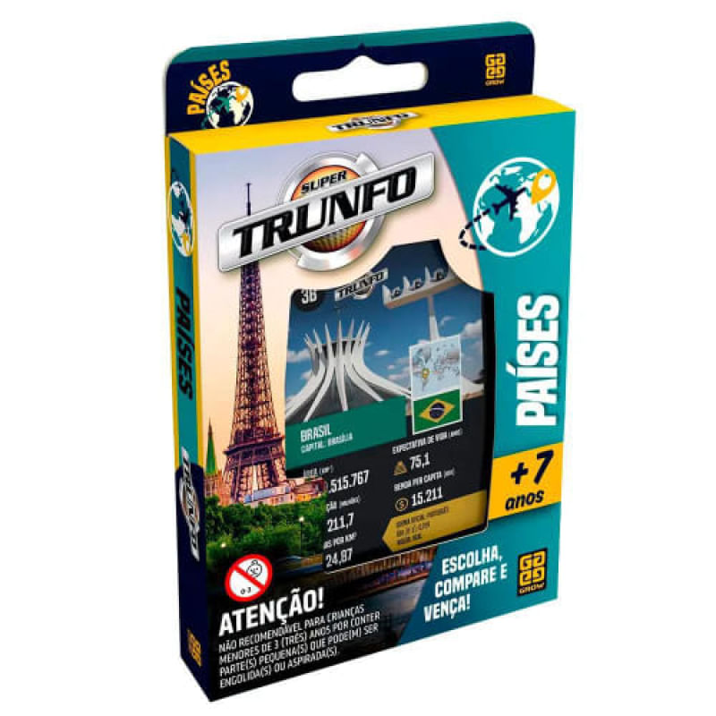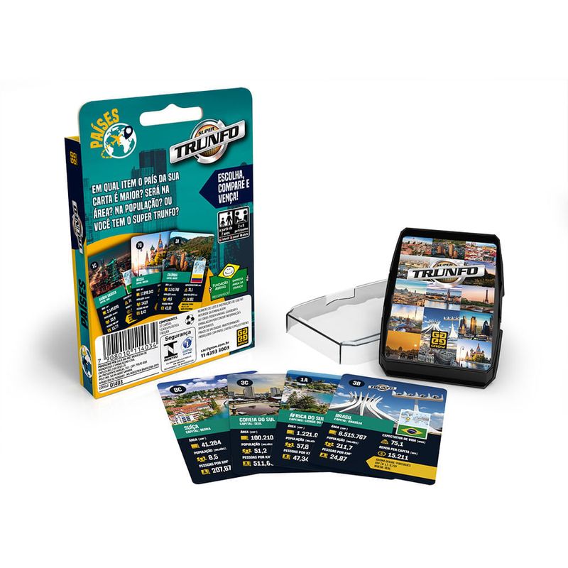 Jogo de Cartas - Super Trunfo - Paises - GROWSuper Trunfo Países traz 32 cartas com ilustrações dos mapas, bandeiras e informações sobre cada país Em qual item o país da sua carta é o melhor Será ele o mais populoso O de maior área Ou você tem o Super Trunfo Escolha, compare e vença esta emocionante disputa! Detalhes: Certificação: Certificado Pelos Órgãos Autorizados - OCP`S(Organismos De Certificação De Produtos) Registri : CE-BRI/ICEPEX-N 01024-25 NM 300/2004 OCP 0046 Características: Conteúdo da Embalagem: 32 cartas, 1 caixa plástica e 1 regra Material/Composição: papel cartão,Plastico Ref: 01403 Marca:Grow Modelo:Super Trunfo Idade Indicada:7+ Linha: Paises Código de Barras: 7908010114034 Aviso: As cores podem variar entre as imagens mostradas acima e o produto Imagens meramente ilustrativas Garantia: Não se aplica