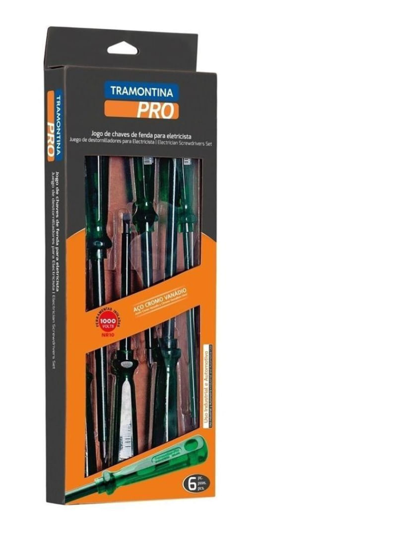 Seja em manutenções industriais ou automotivas, apertar ou afrouxar parafusos se torna mais fácil com a ajuda das Chaves Easygrip da Tramontina PRO. Seu cabo com formato sextavado proporciona maior conforto e agilidade na utilização. Estão disponíveis com ponta chata, cruzada, trafix, trafix PZ e canhão nos modelos tradicional, toco e com isolação. Escolha o tamanho ideal para o seu trabalho e mãos à obra. Informações Gerais: - As hastes das chaves de fenda são testadas em máquina de ensaio específica, para verificar o perfeito balanço entre resistência mecânica e dureza. - Os dimensionais das pontas são verificados com gabaritos-padrão calibrados e certificados, e a qualidade do fosfato é inspecionada ao microscópio. - As chaves de fenda isoladas são amplamente testadas, o que promove segurança na sua utilização em locais com tensões de até 1000 V c. a. - Indicada para trabalhos em redes de tensão até 1.000 volts c. a. - As ferramentas são produzidas e testadas conforme normas específicas. Recomendações de Uso: - Use óculos, luvas e outros equipamentos de proteção individual (EPIs) de acordo com a tarefa a ser executada. - Utilize chaves de fenda isoladas, identificadas pela marcação 1.000 V, quando for necessário trabalhar em locais com corrente elétrica. Importante: nestes casos, inspecione a integridade da isolação elétrica, e, se aparecerem trincas na isolação, suspenda o uso imediatamente. - Utilize chaves com ponta adequada para cada tipo de fenda, para realizar a tarefa de forma mais rápida e segura. - Respeite o torque estabelecido por norma para cada bitola. - Não utilize as chaves de fenda como formão ou alavanca. - Não altere as dimensões originais da ponta para obter outro perfil. - Armazene em local limpo e seco. Características Gerais; - Peso:0,40 kg Composição: - Chave de fenda isolada ponta chata em aço cromo vanádio 3x75 mm (1/8x3) - 44115010