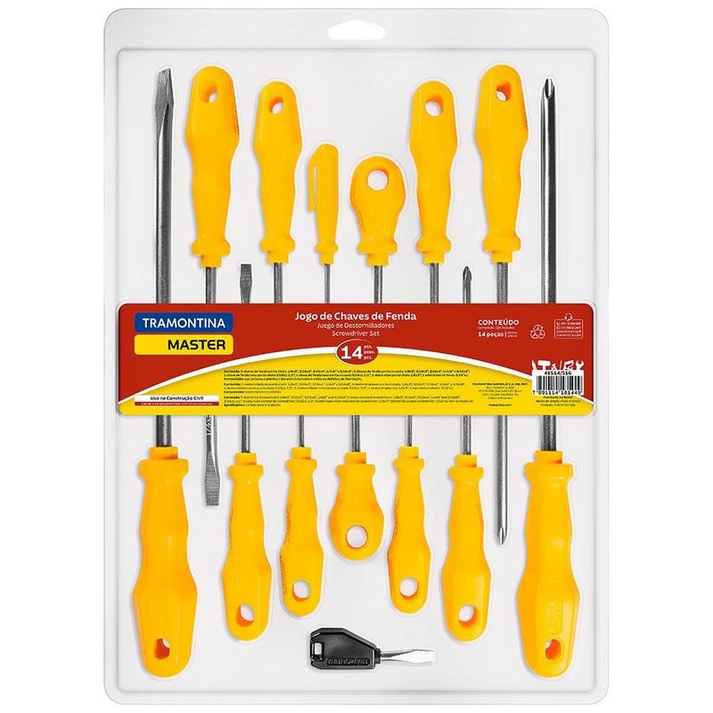 Tenha materiais práticos e funcionais perto de você! O Jogo de Chaves de Fenda Tramontina 14 Peças traz ferramentas utilitárias que auxiliam em diferentes projetos. São quatorze chaves de fenda produzidas com materiais de qualidade e bom gosto. O conjunto traz 5 chaves de fenda ponta chata, 5 chaves de fenda ponta cruzada, 1 chave de fenda toco ponta chata, 1 chave de fenda ponta cruzada, 1 chave clip ponta chata e 1 mini chave de fenda ponta chata, ideais para as necessidades que você encontrar! Ter esse jogo sempre à mão vai tornar seu dia a dia mais prático!