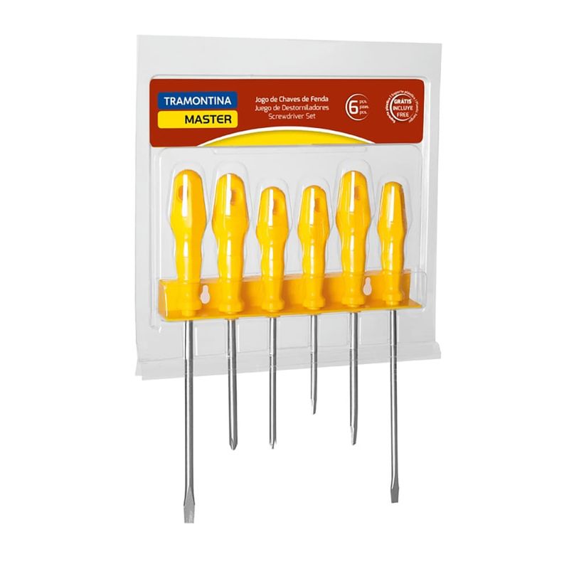 Tenha materiais práticos e funcionais perto de você! O Jogo de Chaves de Fenda Tramontina, com 6 peças, conta com ferramentas utilitárias que auxiliam em diferentes projetos.São quatro chaves de fenda ponta chata e duas chaves de fenda ponta cruzada, ideais para as suas demandas caseiras. Com cabos de alta resistência, o Jogo de Chaves de Fenda Tramontina vai tornar seu dia a dia mais prático!