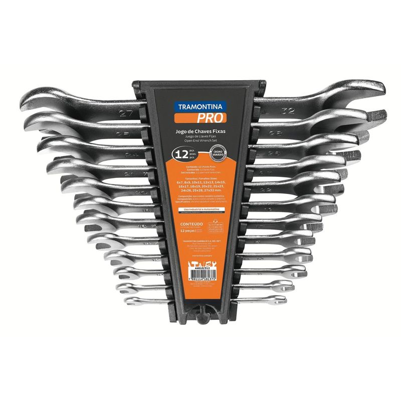Jogo de Chaves Fixas 12 Peças Tramontina PRO Tramontina - Jogo de Chaves Fixas 12 Peças Tramontina PRO As Chaves de Aperto Tramontina PRO com Suporte são ferramentas forjadas em aço cromo vanádio e temperadas, garantindo durabilidade e resistência. Possuem acabamento cromado conferindo não apenas um visual impecável, mas também uma resistência extra à corrosão. E para manter todas essas qualidades organizadas e ao alcance das mãos, incluÃmos um suporte plástico resistente, garantindo que suas ferramentas estejam sempre prontas para qualquer desafio. Não basta ter a ferramenta certa, é preciso ter ela sempre à mão! Forjada em aço cromo vanádio e temperada. Cabeça usinada. Abertura da boca calibrada. Acabamento cromado. Suporte plástico. O jogo contém 8 Chaves fixas dos seguintes tamanhos: 6x7, 8x9, 10x11, 12x13, 14x15, 16x17, 18x19, 20x22, 21x23, 24x26, 25x28, 27x32. Cuidados com o produto Sempre utilizar óculos de segurança para proteger os olhos. Utilizar luvas para proteger as mãos. Sempre utilizar uma chave de bitola correta para cada parafuso ou porca para que não haja folga, pois isso danifica a chave e o parafuso também. Sempre usar a chave perpendicular ao eixo do parafuso e/ou porca. Isto aumenta a vida útil da ferramenta e torna a operação mais segura. Não usar tubos ou outras barras extensoras para obter mais torque. Ao aumentar a distância da aplicação da força aumenta-se o torque que pode ser fornecido ao parafuso, mas também se corre o risco de quebrar a chave. Respeitar o torque estabelecido por norma para cada tamanho de chaves. Não golpear as chaves, a não ser que sejam projetadas para este fim. Não alterar a forma original das chaves. Garantia Garantia total contra vÃcios ou defeitos de fabricação. - - Características Gerais do Produto: Garantia: • 3 Meses