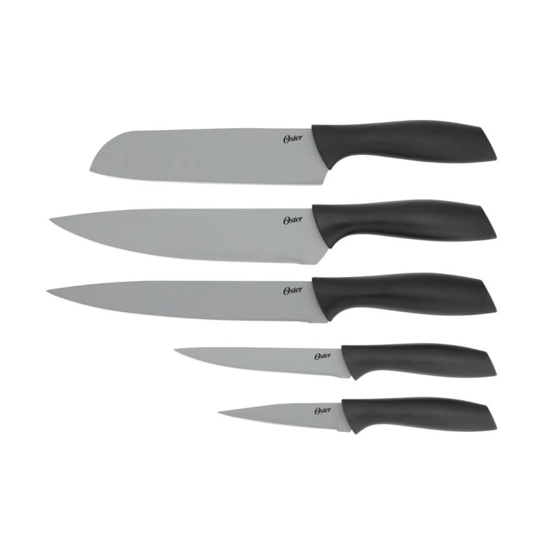JOGO DE FACAS 5 PEÇAS EM AÇO INOXIDÁVEL COM REVESTIMENTO ANTIADERENTE DUNKIRK - OSTERO Jogo de Facas Oster Dunkirk oferece precisão e durabilidade para todas as suas tarefas culinárias, com lâminas em aço inoxidável e revestimento antiaderente.Descrição Detalhada:O Jogo de Facas Oster Dunkirk é a escolha ideal para quem busca eficiência e elegância na cozinha. Composto por 5 peças essenciais, cada faca é fabricada em aço inoxidável de alta qualidade, garantindo resistência à corrosão e durabilidade superior. O diferencial está no revestimento antiaderente exclusivo, que previne que os alimentos grudem nas lâminas, tornando o corte mais suave e a limpeza incrivelmente fácil. Perfeito para diversas tarefas, desde fatiar legumes até preparar carnes, este conjunto eleva a sua experiência culinária, oferecendo precisão e conforto em cada manuseio, consolidando-se como um item indispensável em sua coleção de utensílios de cozinha Oster.Diferenciais:Lâminas de aço inoxidável de alta durabilidade, assegurando resistência e longevidade para o seu jogo de facas.Revestimento antiaderente que evita que os alimentos grudem, facilitando o corte e a limpeza pós-uso.Conjunto de 5 peças essenciais, oferecendo versatilidade para todas as suas necessidades na cozinha, desde o preparo de vegetais até carnes.Design moderno da coleção Oster Dunkirk, que adiciona um toque de sofisticação e estilo à sua cozinha.Mais sobre o Produto:Os cabos das facas são projetados para oferecer uma pegada confortável e segura, minimizando a fadiga durante o uso prolongado e garantindo controle total.O balanceamento perfeito de cada faca garante um manuseio preciso e um controle superior em todas as suas tarefas de corte, otimizando a preparação de alimentos.Este conjunto é ideal para uma ampla gama de atividades, desde o preparo diário de refeições até ocasiões especiais, otimizando sua rotina culinária com ferramentas de qualidade.Dicas de Uso:Para preservar o revestimento antiaderente e a afiação das lâminas, recomenda-se a lavagem manual com detergente neutro e esponja macia.Após a lavagem, seque as facas imediatamente com um pano seco para evitar manchas e prolongar a vida útil do aço inoxidável.Guarde as facas em um bloco de facas ou suporte apropriado para proteger as lâminas e garantir a segurança no armazenamento, mantendo-as sempre prontas para o próximo uso.Ficha Técnica:Produto: JOGO DE FACAS 5 PEÇAS EM AÇO INOXIDÁVEL COM REVESTIMENTO ANTIADERENTE DUNKIRKMarca: OSTERMaterial: Aço Inoxidável com Revestimento AntiaderenteColeção: DunkirkQuantidade por pacote: 5 PeçasEAN: 85081699305Código de Referência: 148148.05