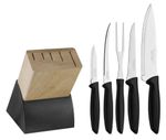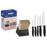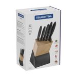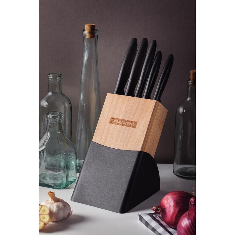 Jogo De Facas Cozinha Gourmet Suporte 6 Pçs Plenus Tramontina Você vai impressionar seus convidados com o jogo de facas Tramontina Plenus com lâminas em aço inox cabos de polipropileno preto e suporte de madeira 6 peças da linha Plenus. São cinco peças produzidas com cabos na cor preta de polipropileno e lâminas de aço inox, resistentes e fáceis de manusear, podendo ser levadas à máquina de lavar louças. Versáteis e com design moderno, se encaixam em diferentes usos. Podem serem usadas desde preparações mais simples até mais elaboradas. O jogo de facas é a escolha ideal para embelezar ainda mais o seu ambiente! Descrição do produtoMarca: TramontinaCor: PretoQuantidade de Peças: 6 PeçasMaterial Cabo: PolipropilenoLinha Comercial: Facas PlenusAltura: 29 cmLargura: 22 cmComprimento: 13 cmPeso: 1,36 Kg Imagens meramente ilustrativas, todos os itens que ambientam o produto não estão inclusos.