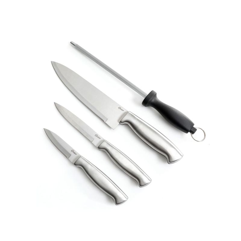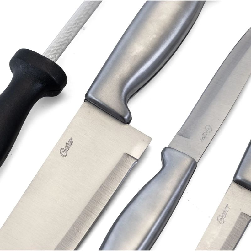 JOGO DE FACAS E CHAIRA PARA CHURRASCO 4 PEÇAS OSTER BALDWYN - AÇO INOXIDÁVEL INOXPrepare o churrasco perfeito com o Jogo de Facas e Chaira Oster Baldwyn, um kit completo de 4 peças em aço inoxidável para precisão e durabilidade.Descrição Detalhada:O Jogo de Facas e Chaira para Churrasco Oster Baldwyn é a escolha ideal para quem busca excelência e precisão na cozinha e no preparo de churrascos. Este kit completo de 4 peças, da renomada marca Oster, é fabricado com lâminas em aço inoxidável de alta qualidade e cabos robustos em aço, garantindo durabilidade, resistência e um desempenho impecável. Essenciais para qualquer cozinha, as facas Baldwyn permitem picar, cortar, fatiar e descascar com facilidade, adaptando-se a diversos tipos de alimentos. Seja para o dia a dia, para um churrasco especial ou para grandes celebrações, este conjunto oferece a ferramenta certa para cada tarefa, elevando o nível de seus preparos culinários.Diferenciais:Conjunto versátil de 4 peças, incluindo 3 facas com tamanhos e funções variadas (Faca do Chef, Faca Utility, Faca para Descascar) e uma chaira amolador para manter suas lâminas sempre afiadas.Fabricadas com lâminas em aço inoxidável de alta qualidade, que oferecem excelente desempenho de corte e resistência à corrosão.Cabos ergonômicos em aço que proporcionam um manuseio seguro e confortável durante o uso.Produto apto para lava-louças, facilitando a limpeza e manutenção (embora a lavagem manual seja recomendada para maior durabilidade).Mais sobre o Produto:A incisão precisa proporcionada por estas facas faz toda a diferença no preparo, sabor e apresentação final de seus pratos, desde o arroz-e-feijão até as mais sofisticadas tortas.O conjunto foi cuidadosamente pensado para que você tenha a faca ideal para cada tipo de alimento, garantindo um corte eficiente em ingredientes moles, fibrosos e diversos outros.Conteúdo completo com Faca do Chef de 20,5cm para cortes maiores, Faca Utility de 13cm para usos gerais, Faca para Descascar de 9cm para trabalhos delicados, e um Amolador de 20,5cm para preservar o fio das lâminas.