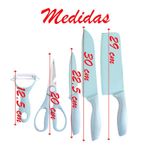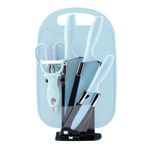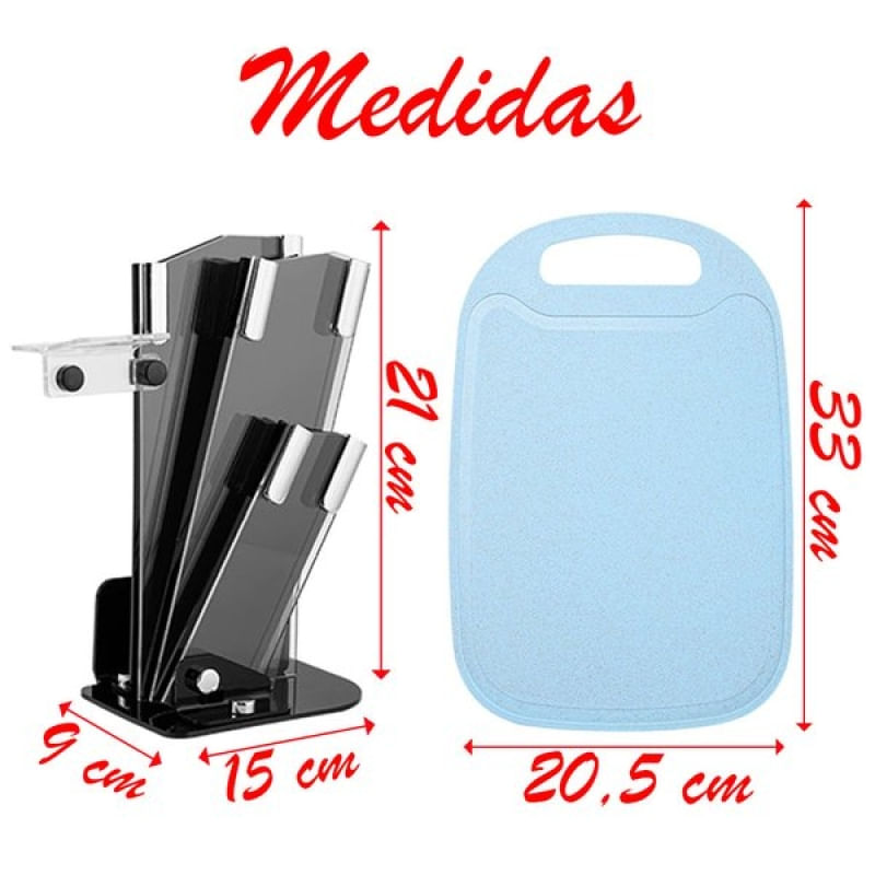 Jogo De Facas Inox Suporte Acrílico 7 Peças Azul - Utensílio de cozinha em inox Vai deixar sua cozinha mais sofisticada e com qualidade. Com um charmoso suporte de Acrílico, ele organiza as 3 Facas, também a tesoura e o Descascador de Legumes, deixando sua cozinha mais elegante. As lâminas de aço inox alemão de fórmula especial, endurecido com gelo, melhor combinação de flexibilidade, afiação durável e anticorrosão.. Os cabos em polipropileno na cor Azul, possui punho ergonómico com um design completamente novo, possuem proteção antimicrobiana, que inibem o crescimento de bactérias e fungos. Fáceis de guardar e limpar, podem ser utilizadas na máquina de lavar louças. Possui também tábua de corte em plástico na cor azul. Uma das Facas, possui um abridor na lamina. O kit conta então com: 1 Suporte de Acrílico. 1 tesoura de corte 1 Descascador de Legumes 1 Tábua para cortar carnes. 3 Facas. Características Gerais do Produto: • Material: Aço Inox; Acrílico Garantia: • Garantia contra avarias no transporte