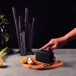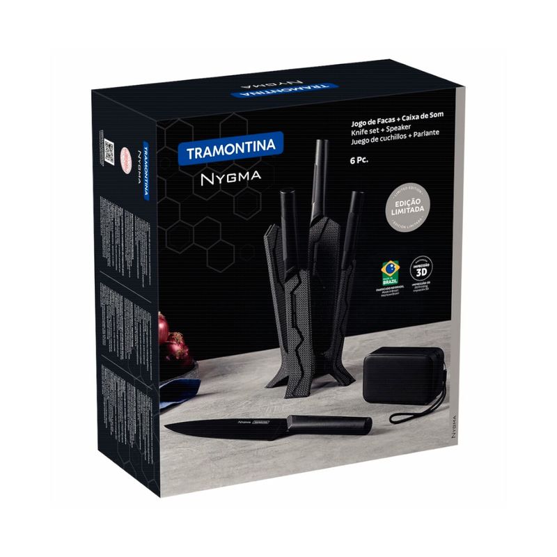 Para atender ao estilo de vida das pessoas conectadas, desenvolvemos o jogo de facas Tramontina Nygma com lâmina em aço inox e cabos de polipropileno preto com suporte e caixa de som 06 peças.Um jogo que quebra os paradigmas, pois vem com caixa de som acoplada e garante experiências incríveis na hora de preparar suas refeições. Um jogo de facas com lâminas de aço inox sublimadas em preto, que garante um excelente poder de corte e maior capacidade de deslizamento do alimento. Os cabos são em polipropileno texturizado e contam com proteção antimicrobiana, que inibem o crescimento de fungos e bactérias. Para que você tenha momentos especiais na sua cozinha, trazemos um suporte em termoplástico biodegradável, desenvolvido com tecnologia de impressão 3D, tornando o design diferenciado e personalizável. Escolha Tramontina e faça bonito em todos os momentos na cozinha!