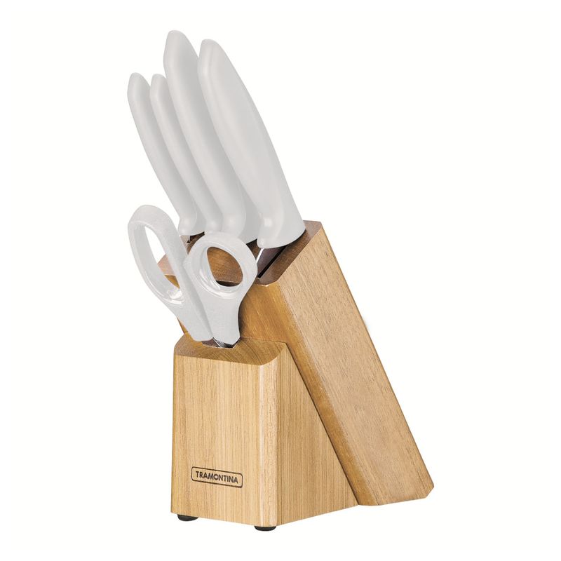 O jogo de facas Tramontina Plenus com lâminas em aço inox cabos de polipropileno Off White e suporte de madeira 6 peças da linha Plenus vai deixar a aparência da sua cozinha mais prática e moderna. São cinco facas produzidas com cabo em polipropileno Off White, resistentes e de fácil manuseio. As lâminas são de aço inox e acompanha um suporte de madeira, perfeito para manter sempre a organização das peças. Fáceis de limpar podem ser levados à máquina de lavar louças. São as facas essenciais que atendem diferentes usosna cozinha.