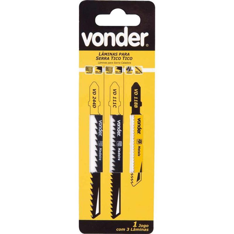 Jogo de Lâminas de Serra Tico-tico, Madeira, Metal, Vonder OstenVonder - Conteúdo da embalagem: 1 Jogo de lâminas de serra tico-tico com 3 peças, sendo: VD 244D, VD 111C e VD 118B. Aplicação: Indicado para serra tico-tico. Jogo misto, sendo o modelo VD 118B para metais e VD 244D e VD 111C para madeiras e derivados. Destaques: Proporciona cortes rápidos e precisos. Referência: 4633100003 Garantia - E (CDC): Garantia legal: 90 dias Tipo de encaixe: Encaixe tipo "T" Material da serra tico-tico: Aço de alto teor de carbono (HCS)/Aço rápido (HSS) Nº dentes/pol: N/A dentes Comprimento total: 100 mm/75 mm Quantidade de peças: 3 peças Comprimento de corte: 75 mm/50 mm Destaques Comercial: Proporciona cortes rápidos e precisos. Aplicação Comercial: Lâminas para serra tico-tico: VD 118B para metais e VD 244D e VD 111C para madeira e derivados. Características Gerais do Produto: Garantia: • 3 Meses