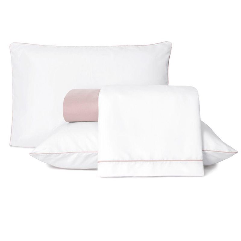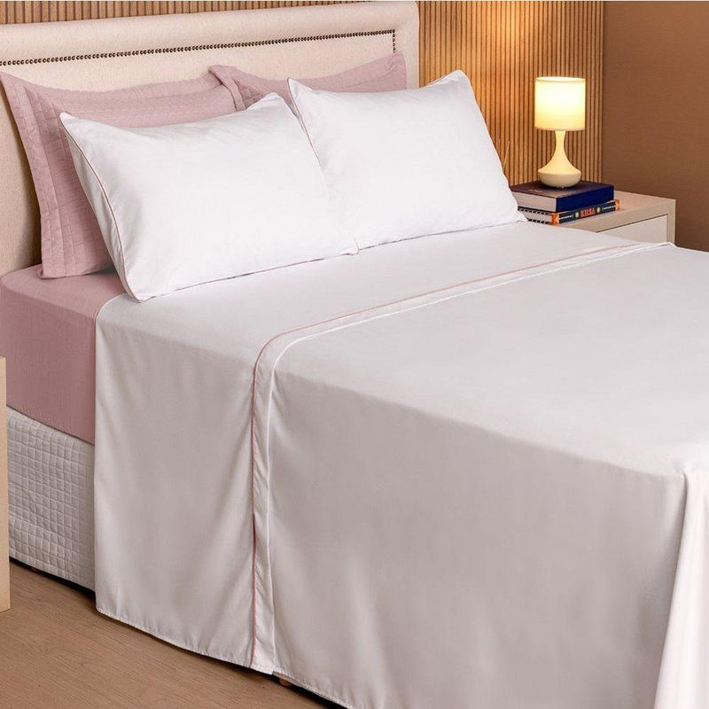 Jogo De Lençol King Linea Percal 200 Fios 4 Peças - RoseO Jogo de Cama Línea é feito com Percal 200 Fios 100% Poliéster, um tecido de grande qualidade e alta durabilidade, que possui o toque super macio e muito confortável. Além disso, o Jogo de Cama Línea é super versátil e também muito prático, pois é fácil de lavar e secar e não precisa passar!O kit conta com fronha e sobre lençol na cor branca. A fronha possui fechamento em envelope, o que facilita a retirada para lavagem. O jogo também acompanha um lençol com elástico nas 04 laterais.Conteúdo Embalagem:01 - Lençol de Cima 2,85m x 2,60m01 - Lençol de Baixo com Elástico para colchão de 2,03m x 1,93m x 40cm alt.02 - Fronhas 70cm x 50cmComposição:Tecido Percal 200 Fios: 100% PoliésterImagens Ilustrativas. Apenas itens descritos acima, compõem o produto. Demais itens, podem ser adquiridos separadamente.Atenção: Certifique-se que as medidas do produto atende as dimensões da cama a qual será utilizado.