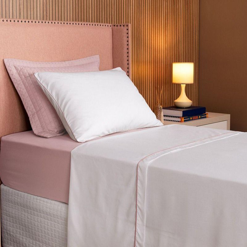 Jogo De Lençol Solteiro Linea Percal 200 Fios 3 Peças - RoseO Jogo de Cama Línea é feito com ;Percal ;200 Fios 100% Poliéster, ;um tecido de grande qualidade e alta durabilidade, que possui o toque super macio e muito confortável. Além disso, o Jogo de Cama Línea é super versátil e também muito prático, pois é fácil de lavar e secar e não precisa passar!O kit conta com fronha e sobre lençol na cor branca. A fronha possui fechamento em envelope, o que facilita a retirada para lavagem. O jogo também acompanha um lençol com elástico nas 04 laterais.Conteúdo Embalagem:01 - Lençol de Cima 2,40m x 1,50m01 - Lençol de Baixo com Elástico para colchão de 1,88m x 88cm x 30cm alt.01 ;- Fronha 70cm x 50cmComposição:Tecido Percal 200 Fios: 100% PoliésterImagens Ilustrativas. Apenas itens descritos acima, compõem o produto. Demais itens, podem ser adquiridos separadamente.Atenção: Certifique-se que as medidas do produto atende as dimensões da cama a qual será utilizado. ;