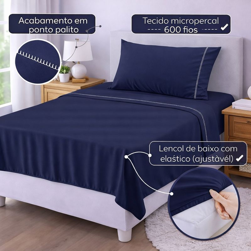 Eleve o conforto do seu quarto com a sofisticação do Micropercal 600 Fios. Este jogo une o toque acetinado e macio à praticidade de um tecido que não amassa facilmente, garantindo uma cama sempre impecável. Diferenciais que você vai amar: Toque Macio (600 Fios): Sinta a suavidade incomparável do tecido micropercal de alta densidade, que não "faz bolinha" e mantém a temperatura agradável. Acabamento em Ponto Palito: Detalhe artesanal na fronha, garantindo um visual elegante e bem acabado para a sua cama. Praticidade no Dia a Dia: O lençol de baixo possui elástico reforçado em toda a volta, garantindo que ele não escape do colchão durante a noite (ajuste perfeito). Fácil Cuidado: Tecido de secagem rápida que quase não amassa, dispensando o uso excessivo de ferro de passar. Contém na embalagem: Lençol de Cima: 1 Unidade Com vira em acabamento ponto palito (2,50m x 1,50m) Lençol de Baixo: 1 Unidade Com elástico para fixação total (2,50m x 1,50m p/ colchão 1,88m X 0,88m X 30cm alt) Fronhas: 1 Unidade Com detalhe lateral em ponto palito (70cm x 50cm) Especificações Técnicas: Material: Micropercal 100% Poliéster Premium. Trama: 600 Fios. Indicação: Ideal para quem busca conforto térmico e elegância. Atenção: As cores do produto podem sofrer pequenas variações devido à configuração da tela do seu dispositivo.