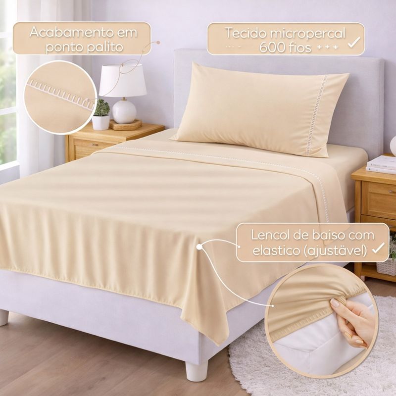 Eleve o conforto do seu quarto com a sofisticação do Micropercal 600 Fios. Este jogo une o toque acetinado e macio à praticidade de um tecido que não amassa facilmente, garantindo uma cama sempre impecável. Diferenciais que você vai amar: Toque Macio (600 Fios): Sinta a suavidade incomparável do tecido micropercal de alta densidade, que não "faz bolinha" e mantém a temperatura agradável. Acabamento em Ponto Palito: Detalhe artesanal na fronha, garantindo um visual elegante e bem acabado para a sua cama. Praticidade no Dia a Dia: O lençol de baixo possui elástico reforçado em toda a volta, garantindo que ele não escape do colchão durante a noite (ajuste perfeito). Fácil Cuidado: Tecido de secagem rápida que quase não amassa, dispensando o uso excessivo de ferro de passar. Contém na embalagem: Lençol de Cima: 1 Unidade Com vira em acabamento ponto palito (2,50m x 1,50m) Lençol de Baixo: 1 Unidade Com elástico para fixação total (2,50m x 1,50m p/ colchão 1,88m X 0,88m X 30cm alt) Fronhas: 1 Unidade Com detalhe lateral em ponto palito (70cm x 50cm) Especificações Técnicas: Material: Micropercal 100% Poliéster Premium. Trama: 600 Fios. Indicação: Ideal para quem busca conforto térmico e elegância. Atenção: As cores do produto podem sofrer pequenas variações devido à configuração da tela do seu dispositivo.