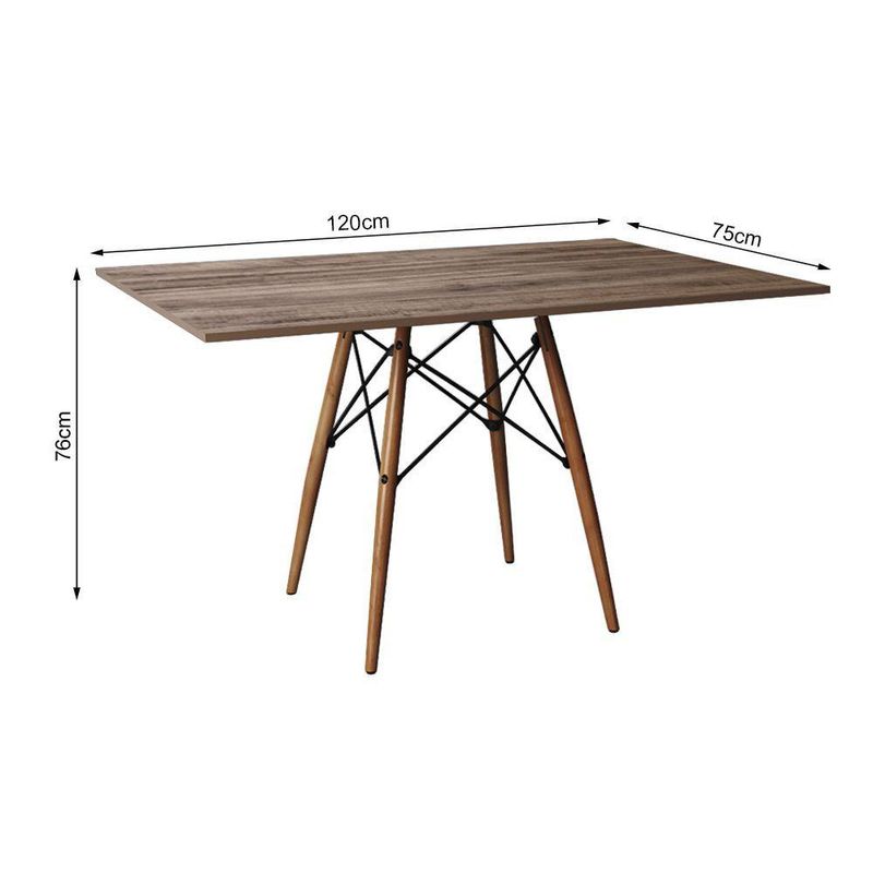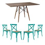Jogo De Mesa Eiffel Retangular Tampo De Madeira 120x75cm Amêndoa Com 4 Cadeiras Katrina Azul TurquesJogo De Mesa Eiffel Retangular Tampo De Madeira 120x75cm Amêndoa Com 4 Cadeiras Katrina em Aço Azul Turquesa Assento BegeA sua cozinha ou sala de jantar ficará completa com esse lindo Conjunto de Mesa e Cadeiras! Contendo um design de móveis moderno, elegante e com uma ousada combinação de cores, esse é um kit que certamente é uma solução que esbanja estilo, elegância e muito requinte.O conjunto tem em sua diversificada estrutura de materiais com altíssima qualidade, que proporciona muito mais resistência, mesmo com o passar dos anos, e com seus 4 assentos Katrina Aço é ideal para um jantar em família sem abrir mão do conforto. O Kit acompanha versatilidade e combina com vários tipos de decoração, o que dá mais praticidade em sua casa sem abrir mão de um espaço a mais na mesa.Informações técnicas Conjunto:Conteúdo da Embalagem: 01 Mesa e 04 Cadeiras (Embalados Separadamente).Instruções/Cuidados: Limpar com pano seco ou levemente umedecido com água.Necessita de Montagem? Sim.Mesa:Modelo: Eiffel WoodTipo: RetangularCor do tampo: AmêndoaCor da base dos pés: Wood (Madeira)Material do tampo: MadeiraMaterial dos pés: MadeiraDimensões: Altura: 76 cm // Largura: 120 cm // Profundidade: 75 cmCadeiras:Modelo: KatrinaCor: Azul Turquesa e BegeMaterial da estrutura: Aço com Pintura E-PoxMaterial do assento: Espuma D14 com Revestimento em Corano.Dimensões: Altura: 90 cm // Largura: 50 cm // Profundidade: 55 cmJogo de Mesa Eiffel Retangular Tampo de Madeira 120x75cm Amêndoa com 4 Cadeiras Katrina Azul Turques