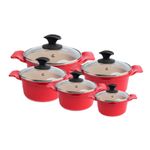 Jogo de Panela Vermelha Marmorizada Javali AA 16 a 24cm A panela antiaderente, também conhecida como teflon, é revestida com uma substância capaz de repelir certas substâncias. Por isso, a comida não gruda nela. É resistente a altas temperaturas e a arranhões. As panelas em alumínio antiaderente contam com uma camada que cobre o seu material e evita que o alimento grude em seu interior. Dessa forma, contribuem para uma culinária saudável, dispensando o uso excessivo de gordura ou óleos vegetais. Para quem gosta de um peixe ou filé de frango grelhado, ou não dispensa um omelete delicioso, não pode deixar de ter uma em sua cozinha. Manutenção e Dicas: 1. Não use metal na sua panela antiaderente. 2. Evite grandes mudanças de temperatura. (Levar uma panela quente para a água fria pode fazer com que a panela deforme.) 3. Limpe suas panelas antiaderentes com esponjas que não causem riscos. 4. Use detergentes mais suaves para limpar suas panelas antiaderentes. 5. Não é ideal para máquina lava louças. 6. Evite altas temperaturas de cozimento. 7. Não deixe a panela vazia no fogo. Especificações Técnicas 16 a 24cm: Revestimento Externo: Alumínio Fundido Vermelha. Revestimento Interno: Antiaderente Marmorizado Cor Creme. Alça Alumínio Tampa de Vidro. Medidas Caçarolas: 16cm / 0,800Kg / Altura: 9cm / Litragem: 1,2L. 18cm / 1Kg / Altura: 10cm / Litragem: 1,7L. 20cm / 1,15Kg / Altura: 9cm / Litragem: 2,3L. 22cm / 1,50Kg / Altura: 9,5cm / Litragem: 2,9L. 24cm / 1,55Kg / Altura: 10cm / Litragem: 3,6L. Itens Inclusos: 01 Jogo de Panela Vermelha Marmorizada Javali AA 16 a 24cm. 01 Jogo de Tampas de Vidro 16 a 24cm + Batoque. Código: 2004-JAV.