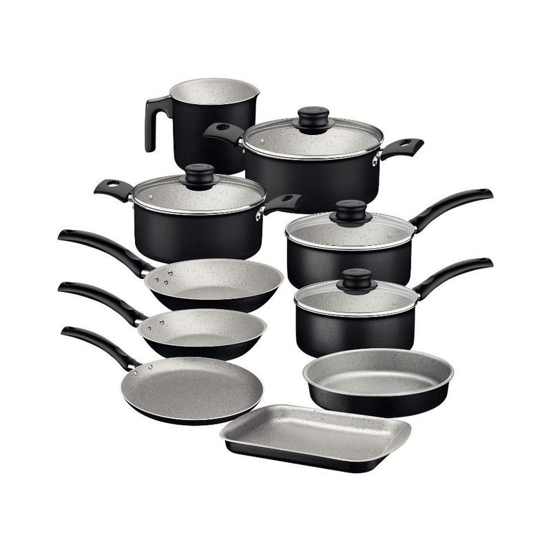 Jogo De Panelas Tramontina 10 Peças Antiaderente Turim Seja qual for a receita que você vai preparar, é essencial contar com itens de qualidade, como o jogo de panelas Tramontina Turim em alumínio com revestimento interno e externo em antiaderente Starflon Max 10 peças. Aptas para uso no dia a dia, suas peças garantem maior segurança e facilidade na hora preparar suas refeições, pois contam com cabos, alças e pegadores em baquelite e nylon e vem com tampas de vidro temperado com borda de aço inox. Você ainda cozinha de maneira rápida e uniforme, sem que os alimentos grudem em sua superfície e tem facilidade na limpeza, pois o corpo das peças tem produção em alumínio com revestimento em antiaderente Starflon Max. Escolha Tramontina e deixe suas tarefas na cozinha, ainda melhores! Descrição do produto Material: Alumínio Cor: Preto ou Rosa Linha Comercial: Turim Quantidade: 10 Peças Revestimento Interno: Antiaderente Tipo de Fogão: Gás, Elétrico, Vitrocerâmico - resistência elétrica Máquina de Lavar Louça: Sim Assadeira Rasa 28 cm 2,0 L; Assadeira redonda 22 cm 1,7 L; Caçarola 18 cm 2,0 L; Caçarola 20 cm 2,8 L; Fervedor 12 cm 1,2 L; Frigideira 16 cm 0,4 L; Frigideira 20 cm 0,8 L; Panela 14 cm 0,8 L Turim; Panela 16 cm 1,4 L; Panquequeira/Tapioqueira 22 cm 0,6 L Imagens meramente ilustrativas, todos os itens que ambientam o produto não estão inclusos.
