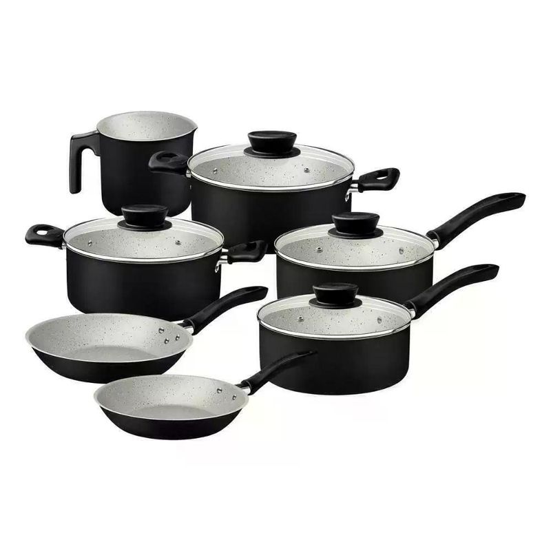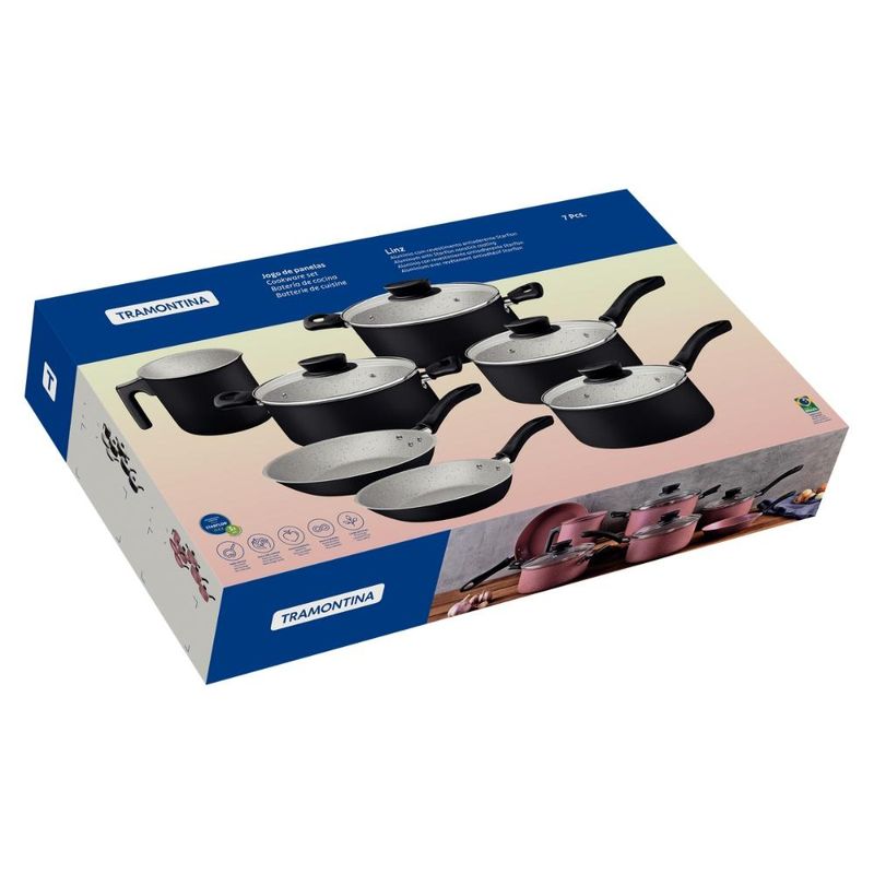 Jogo De Panelas 7 Peças Linz Cores Antiaderente Tramontina Descubra a eficiência na sua cozinha com o jogo de panelas Tramontina Linz em alumínio com revestimento interno e externo em antiaderente Starflon Max. Ideal para uso diários, as peças proporcionam cozimento rápido e uniforme, sem que grudem na superfície, pois contam com revestimento interno e externo de antiaderente Starflon Max. As peças ainda são de fácil limpeza e livres de PFOA, assegurando maior praticidade e segurança alimentar. As tampas de vidro temperado com bordas de aço inox oferecem visibilidade durante o preparo, enquanto os cabos e alças de baquelite antitérmico e os pegadores de nylon proporcionam segurança e conforto no manuseio. Compatíveis com fogões a gás, elétricos e vitrocerâmicos, as peças do jogo ainda podem ser lavadas na máquina de lavar louças, tornando seu dia a dia mais eficiente! Descrição do produto Marca: Tramontina Material: Alumínio Revestimento Interno: Antiaderente Linha comercial: Linz Composição / Quantidade: 7 Peças Máquina de Lavar Louça: Sim Composição Frigideira Ø 16 cm 0,4 L Linz Frigideira Ø 20 cm 0,8 L Linz Caçarola Ø 18 cm 2 L Linz Caçarola Ø 20 cm 2,8 L Linz Panela Ø 16 cm 1,4 L Linz Panela Ø 18 cm 2,0 L Linz Fervedor Ø 12 cm Imagens meramente ilustrativas, todos os itens que ambientam o produto não estão inclusos.
