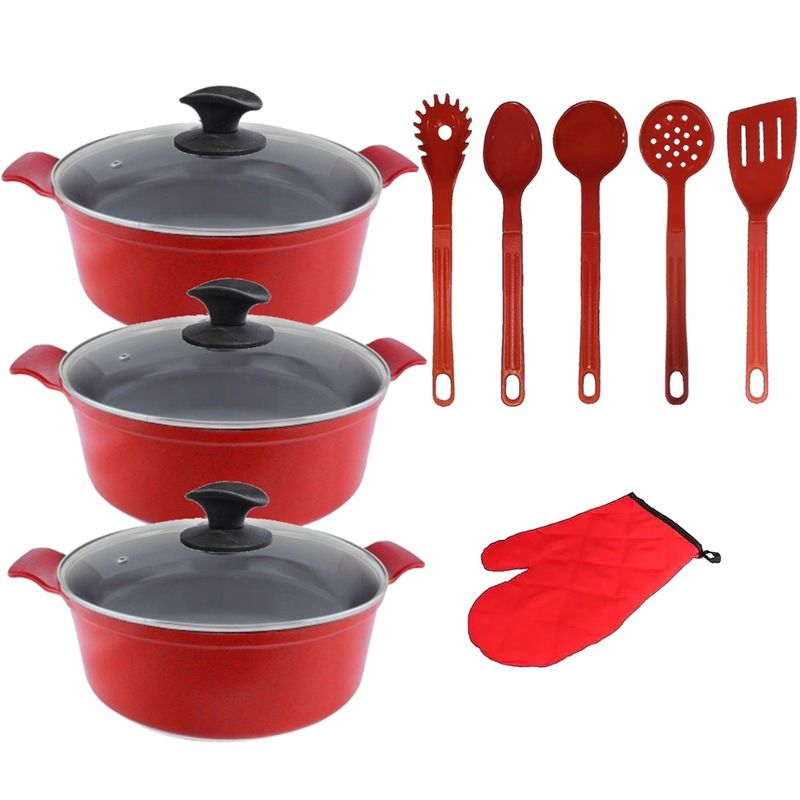 Jogo de Panelas Vermelho Cerâmica Com Talher Javali AAL 26A30 A panela antiaderente é fabricada com outros materiais e ganham uma cobertura em cerâmica, garantindo assim um revestimento atóxico e antiaderente, capaz de repelir certas substâncias. Por isso, a comida não gruda nela. É resistente a altas temperaturas e a arranhões. As panelas em cerâmica antiaderente contam com uma camada que cobre o seu material e evita que o alimento grude em seu interior. Dessa forma, contribuem para uma culinária saudável, dispensando o uso excessivo de gordura ou óleos vegetais. Para quem gosta de um peixe ou filé de frango grelhado, ou não dispensa um omelete delicioso, não pode deixar de ter uma em sua cozinha. Manutenção e Dicas: 1. Não use metal na sua panela de cerâmica. 2. Evite grandes mudanças de temperatura. (Levar uma panela quente para a água fria pode fazer com que a panela deforme.) 3. Limpe suas panelas com esponjas que não causem riscos. 4. Não é ideal para máquina lava louças. 5. Evite altas temperaturas de cozimento. 6. Não deixe a panela vazia no fogo. Especificações Técnicas 16 a 24cm: Revistimento Interno: Antiaderente em Cerâmica cor Cinza. Revestimento Externo: Alumínio Fundido Preto Liso. Alça Alumínio Tampa de Vidro. Medidas Caçarolas: 16cm / 0,800Kg / Altura: 9cm / Litragem: 1,2L. 18cm / 1Kg / Altura: 10cm / Litragem: 1,7L. 20cm / 1,15Kg / Altura: 9cm / Litragem: 2,3L. 22cm / 1,50Kg / Altura: 9,5cm / Litragem: 2,9L. 24cm / 1,55Kg / Altura: 10cm / Litragem: 3,6L. Especificações Técnicas Talheres: Modelos: Macarrão, Arroz, Concha Feijão, Escumadeira e Espátula. Medidas: 28cm (Todos os modelos) Material: Nylon. Cor: Laranja. Itens Inclusos: 01 Jogo Panela Preto Liso Antiaderente Cerâmica Javali AA1 16 a 24cm. 01 Jogo de Tampas de Vidro 16 a 24cm + Batoque. 05 Talheres em Nylon Antiaderente Laranja. 01 Luvas Térmica em Pano Reforçado. Código: 0016A24C.AA1L-JAV ProdutoLojaPlast.