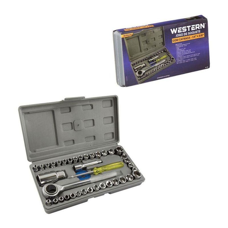 Jogo De Soquete Western Com Maleta 39 PecasUm jogo de ferramentas completo, contendo 39 peças feitas em aço carbono e PVC. Tratadas termicamente para alta durabilidade e resistência, ferramentas com versatilidade uso do dia a dia!- Caracteristicas:? Aperto e desaperto de parafusos com Adaptador e Extensor para locais de dificil acesso;? Acompanha estojo.- Antes do uso:? Verificar se o produto está em perfeitas condições de uso ou instalação.- Perigos:? Cuidado durante o manuseio do produto para evitar acidentes.- Cuidados:? Utilize equipamento de proteção individual necessário ao trabalho (óculos de proteção, botas, etc.);? Use a ferramenta correta para cada tipo de trabalho. Não force a ferramenta. A ferramenta correta fara o trabalho melhor e mais seguro se utilizada para aquilo que foi projetada;? Guarde em local seco e arejado, longe da umidade;? Guarde estas instruções para futuras consultas.- Advertência/Atenção:? Manter fora do alcance das crianças;? Trabalhe seguro.Oferecemos ferramentas de qualidade que não podem com toda certeza faltar no seu jogo!*Imagens meramente ilustrativas.Especificações Técnicas- Contém:? 1 Chave Catraca Reversível: 3/8?? 1 Extensão: 3/8? (7 cm)? 1 Cabo? 1 Adaptador ¼? ? 3/8?? 1 Disco de Rotação? 3 Soquetes 1/4?: 1/4?, 5/16? e 3/8?? 2 Soquetes: 3/8?: 15 mm e 5/8 mm? 1 Soquete: 3/8? sextavado para vela: 21mm? 14 Soquetes: ¼?: 4 mm, 4,5mm, 5mm, 5,5mm, 6mm, 6,5mm, 7mm, 7,5mm, 8mm, 9mm, 10mm, 11mm, 12mm e 13mm? 14 Soquetes ¼?: 5/32?, 3/16?, 7/32?, ¼?, 9/32?, 5/16?, 11/32?, 3/8?, 13/32?, 7/16?, 15-32?, ½?, 17/32? e 9/16?- Dimensões da Embalagem: 24 x 13 x 4cm (CxLxA)- Tipo de Embalagem: Shrink e cinta- Quantidade Master: 20 Peças- Dimensões Master: 51 x 25,5 x 20,5cm (CxLxA)- Material:Aço carbono e Plástico (Polietileno)- Cor:Prata- Marca:Western