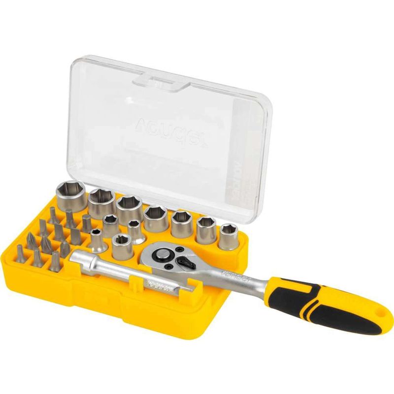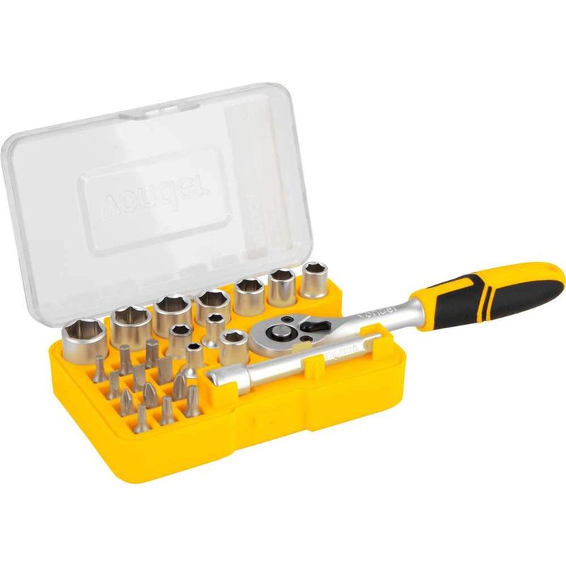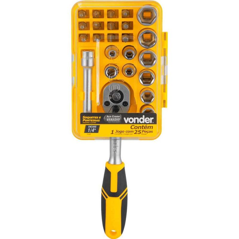 Jogo de Soquetes e Ponteiras com Encaixe de 1/4", 4 mm a 13 mm, com 25 Peças Vonder OstenVonder - Conteúdo da embalagem: 1 Jogo de soquetes e ponteiras composto por 25 peças, sendo: 1 catraca 1/4", 1 extensão 1/4" x 75 mm, 1 adaptador 1/4", soquetes sextavados 1/4" (4 mm, 5 mm, 6 mm, 7 mm, 8 mm, 9 mm, 10 mm, 11 mm, 12 mm, 13 mm), bits sextavados (3 mm, 4 mm, 5 mm), bits fenda (4 mm, 5 mm, 6 mm), bits phillips (PH1, PH2, PH3), bits hexalobular (T15, T20, T25). Acompanha estojo plástico. Aplicação: Indicado para apertar e soltar porcas e parafusos, utilizando o acessório adequado. Destaques: Produzido em aço cromo vanádio, proporcionando maior resistência e durabilidade. Referência: 3029014025 Garantia - E (CDC): Garantia legal: 90 dias Encaixe: 1/4" Material do jogo de soquete: Aço cromo vanádio Número de peças do jogo de soquete: 25 peças Torque máximo da catraca: 62 N.m Capacidade: 4 mm a 13 mm Massa aproximada (peso): 0,567 kg Destaques Comercial: Produzido em aço cromo vanádio, proporcionando maior resistência e durabilidade. Aplicação Comercial: Indicado para apertar e soltar porcas e parafusos com o acessório adequado. Características Gerais do Produto: Garantia: • 3 Meses