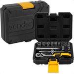 Jogo De Soquetes Sextavado Encaixe 1/4" 16 Peças VonderJogo de Soquetes Sextavado Encaixe 1/4 16 Peças Vonder ? Versatilidade e Resistência para seu Dia a DiaO Jogo de Soquetes Sextavado Encaixe 1/4 16 Peças Vonder é ideal para quem busca precisão e durabilidade em tarefas mecânicas, automotivas e domésticas. Fabricado em aço cromo vanádio, resistente ao desgaste e corrosão, garante maior vida útil e .Com 12 soquetes sextavados (4 mm a 13 mm), oferece ampla aplicação em parafusos e porcas. A catraca tem torque máximo de 74 , garantindo eficiência.Inclui cabo T, extensor de 100 mm, adaptador 1/4 x 1/4 e catraca 1/4, facilitando ajustes em locais de difícil acesso.Acompanha maleta plástica compacta, facilitando e organização. Ideal para mecânicos, instaladores e uso doméstico, é e prático para apertos e desapertos de fixadores.Especificações- Material do jogo de soquete: Aço cromo vanádio- Encaixe: 1/4- de peças do jogo de soquete: 16 peças- Capacidade: 4 mm a 13 mm- Torque máximo da catraca: 74 - Massa aproximada (peso) (kg): 0,650 kgItens inclusos- 12 soquetes sextavados de encaixe 1/4 (4 mm, 4,5 mm, 5 mm, 5,5 mm, 6 mm, 7 mm, 8 mm, 9 mm, 10 mm, 11 mm, 12 mm e 13 mm)- 1 cabo T encaixe 1/4, 1 extensor 100 mm, 1 adaptador para bits 1/4 x 1/4 e 1 catraca com encaixe 1/4- Maleta PlasticaGarantia- 3 meses com o Fabricante Produto: Jogo de Soquetes Sextavado Encaixe 1/4 | Cor: Preto | Tipo de Chave: Combinada | Tamanho: 1/4