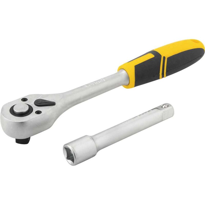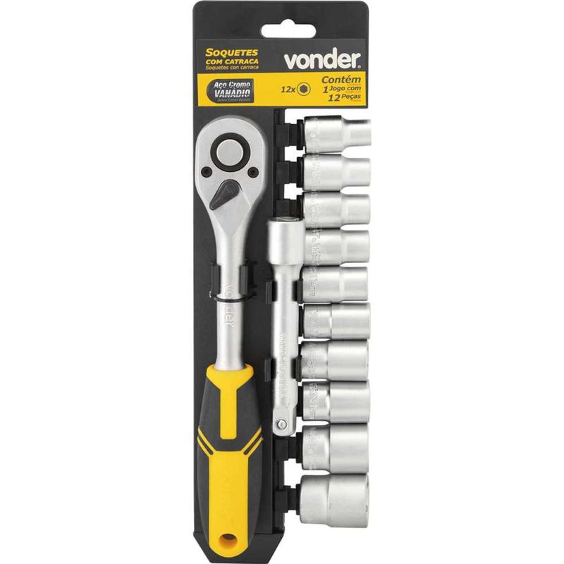 Jogo de Soquetes Sextavados com Encaixe de 1/2", 10 mm a 24 mm, com Catraca, 12 Peças, Vonder OstenVonder - Conteúdo da embalagem: 1 Jogo de soquetes composto por 12 peças, sendo: 1 catraca 1/2", 1 extensão 1/2" x 5", soquetes sextavados 1/2" (10 mm, 11 mm, 12 mm, 13 mm, 14 mm, 15 mm, 17 mm, 19 mm, 22 mm, 24 mm). Aplicação: Indicado para apertar e soltar porcas e parafusos sextavados, com o auxÃlio de acessórios manuais. Conhecido como jogo de pito/cachimbo. Destaques: Produzido em aço cromo vanádio, proporcionando maior resistência e durabilidade. Garantia - E (CDC): Garantia legal: 90 dias Referência: 3029120010 Material do jogo de soquete: Aço cromo vanádio Número de peças do jogo de soquete: 12 peças Encaixe: 1/2" Massa aproximada (peso): 1,54 kg Torque máximo da catraca: 512 N.m Destaques Comercial: Produzido em aço cromo vanádio, proporcionando maior resistência e durabilidade. Aplicação Comercial: Usado para apertar e soltar porcas e parafusos sextavados com acessórios manuais. Jogo de pito/cachimbo. Características Gerais do Produto: Garantia: • 3 Meses