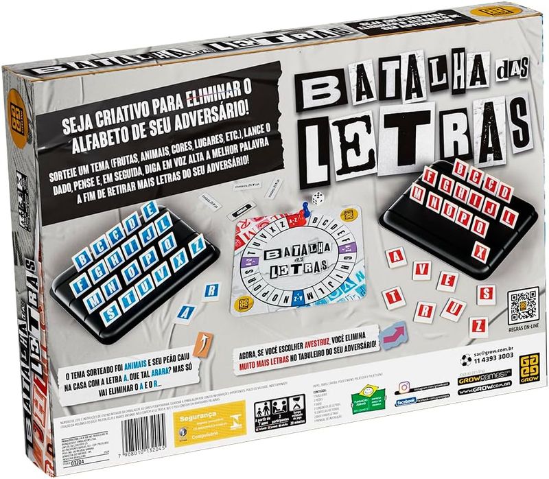 Jogo de Tabuleiro - Batalha Das Cores - Preto - GROWJogo de tabuleiro onde o objetivo é eliminar as letras do adversário Escolha o tema, sorteie uma letra e diga a melhor palavra Acompanha letras e base, tabuleiro, peões e dadoDetalhes: Certificação: Certificado Pelos Órgãos Autorizados - OCP`S(Organismos De Certificação De Produtos) Código De Certificação: CE-BRI/ICEPEX-N 01264-25 OCP 0046Características: Conteúdo da Embalagem: 1 Tabuleiro e Acessórios Material/Composição: papel cartão,Plastico Ref: 03204 Marca:Grow Modelo:Batalha das Letras Idade Indicada:7+ Código de Barras: 7891219032042 Aviso: As cores podem variar entre as imagens mostradas acima e o produto Imagens meramente ilustrativasGarantia: 03 Meses Contra Defeito De fabrica