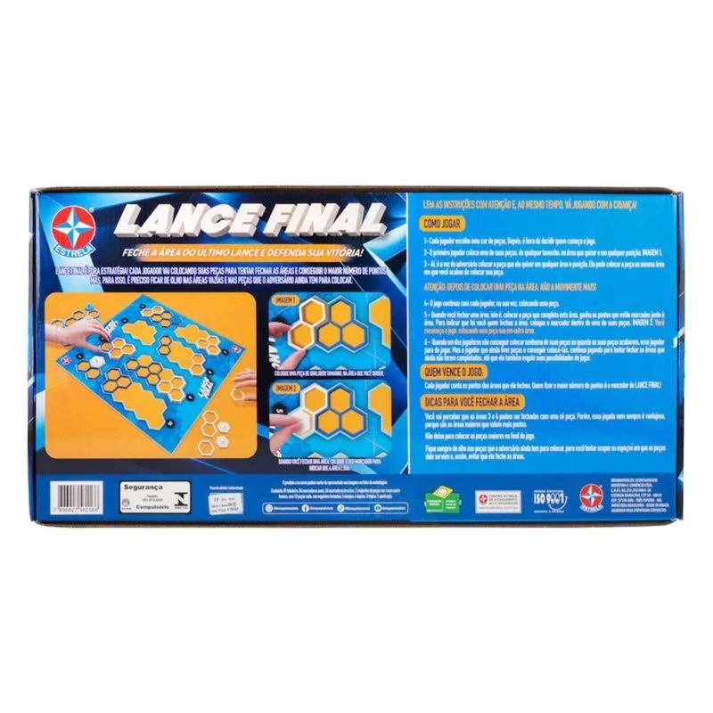 - Lance Final é um jogo de pura estratégia! - Cada jogador vai colocando suas peças para tentar fechar as áreas e conseguir o maior número de pontos. - Mas cuidado! É preciso ficar de olho nas áreas vazias e nas peças que o adversário ainda tem para colocar.Características:Marca - EstrelaQuantidade de Jogadores - 2 JogadoresIdade recomendada - A partir de 7 AnosNão recomendado para menores de 3 AnosInmetro - 001812/2020Conteúdo da emabalagem - 01 tabuleiro, 06 marcadores azuis, 06 marcadores brancos, 2 conjuntos de peças nas cores azul e branco, com 13 peças cada, nos seguintes formatos: 5 simples; 4 duplas; 3 triplas; 1 quádrupla