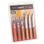 Com o Jogo de Talheres para Churrasco Tramontina seus convidados saboreiam as diversas receitas de carne com total comodidade!Ele é formado por doze utensílios próprios para churrasco. São facas e garfos confeccionados em aço inox com cabos rústicos e naturais. Contam com espessura necessária para evitar deformações e lâminas com maior durabilidade do fio devido ao tratamento térmico.
