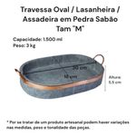Jogo De Travessa Oval Lasanheira Em Pedra SabãoJogo de Travessaa ovais / Assadeiras produzidos em Pedra Sabão com acabamento e alças em cobre.Duráveis e charmosas as travessas de pedra sabão combinam com todos os ambientes e cardápios, você pode utiliza-las tanto para o preparo quanto para servir variedades de comidas e estilos de montagem de mesa ou buffet.Este jogo contém:01 - Assadeira Grande:- Comprimento (INTERNO): 38 cm.- Largura (INTERNO): 21 cm.- Altura: 5,5 cm.- Peso: 4,100 Kg.- Capacidade: 3000 ml01 - Assadeira Média:- Comprimento (INTERNO): 30 cm.- Largura (INTERNO): 18 cm.- Altura: 5,5 cm.- Peso: 3 Kg.- Capacidade: 1500 ml01 - Assadeira Pequena:- Comprimento (INTERNO): 17 cm.- Largura (INTERNO): 11 cm.- Altura: 5,5 cm.- Peso: 1,4 Kg.- Capacidade: 650 ml** Características Técnicas (valores aproximados)** Por se tratar de um produto natural e artesanal pode haver pequenas variações de coloração, traços, medidas ou capacidade em relação a descrição e fotos.** Os produtos de Pedra Sabão devem passar por um processo de cura, que sela e aumenta a resistência da pedra. O processo é simples e leva apenas alguns minutos. Enviaremos instruções de como curar seu produto. Com a cura a pedra escurece, ficando num tom próximo ao preto...O uso de pedra sabão tem sido cada vez mais comum em cozinhas de todo o Brasil. Inclusive, é uma febre entre chefes de cozinha e influencers da área de gastronomia. Além de dar mais sabor aos alimentos, proporciona muitos benefícios para a nossa saúde. Estudos recentes mostraram que, durante o processo de cozimento em utensílios de pedra sabão, há transmissão de nutrientes benéficos como o ferro, zinco, cálcio e magnésio da panela para os alimentos.A ingestão de ferro contribui para aumento da nossa energia e disposição, além de prevenir o envelhecimento precoce, melhorar nossa concentração, reduzir o risco de doenças e fortalecer cabelo e unhas.Já o zinco auxilia no fortalecimento do nosso sistema imunológico e ajuda a acelerar o processo de cicatrização e afastar o surgimento de infecções e outras doenças, como o diabetes e alguns tipos de câncer.O cálcio, por sua vez, é fundamental para a mineralização dos nossos ossos e dentes. Também é o principal agente responsável pela divisão celular, pela contração dos músculos, secreção de hormônios e coagulação sanguínea.O magnésio é um mineral que desempenha um papel em mais de 300 reações enzimáticas em nosso organismo. Dentre as suas funções estão o auxílio na função muscular e nervosa, além de contribuir para regular nossa pressão sanguínea e fortalecer nosso sistema imunológico.