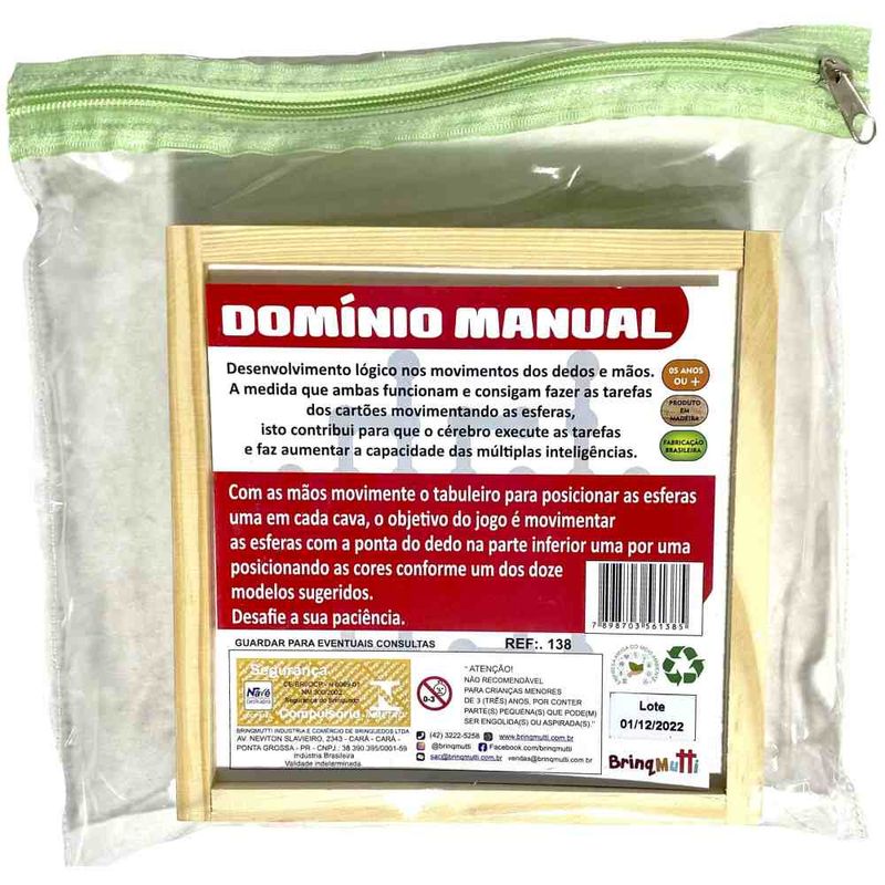 Jogo Dominio Manual - Madeira - BrinqMutti Um jogo diferente e estimulante para treinar as 2 mãos no tabuleiro. Concentração e domínio dos movimentos são muito importantes neste jogo, que é um desafio para todas as idades e todos irão querer brincar. Uma caixa de madeira com bolinhas coloridas e percursos para movimentar as bolinhas, escolha uma ficha modelo e com muita paciência coloque as duas mão no tabuleiro e reproduza a forma es cores informadas. Um jogo muito divertido para o desenvolvimento psicomotor que diverte e ensina, pode ser utilizado por escolas como instrumento pedagógico, por psicólogos infantis e terapeutas ocupacionais, mas pode ser para brincar em casa com os familiares. Além da coordenação motora também aprimora a percepções ligadas a lateralidade, organização espacial e temporal, domínio sobre o próprio corpo, discriminação das cores, e nomeações, percepção de ordem, conjunto, formas, composição, além de aspectos emocionais e cognitivos, tudo para auxiliar o desenvolvimento das crianças brincando. Contém: 1 caixa tabuleiro com esferas e percursos e 12 fichas Idade: 05 anos+ A BrinqMutti foi criada com o intuito de disponibilizar no mercado: brinquedos inteligentes, educativos, pedagógicos, didáticos e lúdicos, que proporcionam desenvolvimento intelectual! Buscando qualidade em seus produtos e excelência em seu atendimento! As imagens são ilustrativas, os produtos podem variar na sua tonalidade ou cor de acordo com a remessa!
