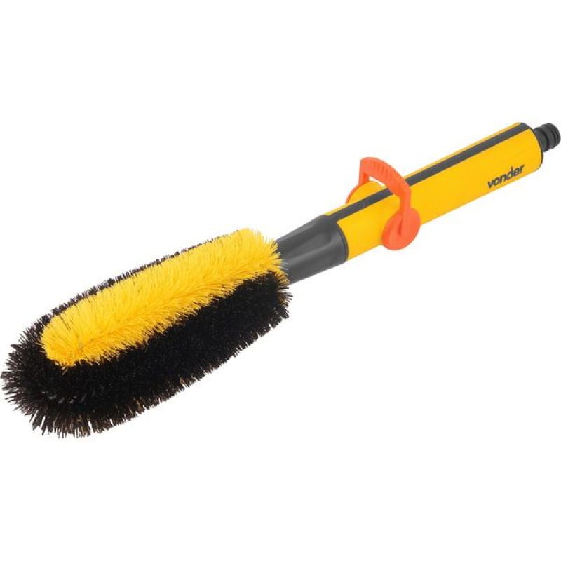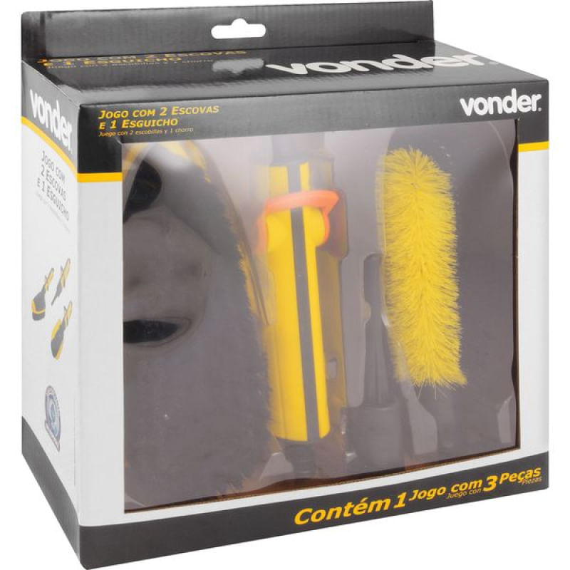 Conteúdo da Embalagem:1 jogo com 2 escovas (1 escova de rodas e 1 escova fixa reta) e 1 esguichoDescrição:Jogo com 2 escovas e 1 esguicho, conector de 1/2" para mangueira, VONDERAplicações e dicas de uso:Indicado para limpeza em geral. As escovas são ideais para limpeza de automóveis (pneus, rodas, caixa de ar e tapetes), pisos, vidros, fachadas, entre outros, e o esguicho para limpeza de calçadas, veículos e jardinagem.Destaques e diferenciais:Conectado diretamente na mangueira de jardim. As escovas limpam e enxaguam ao mesmo tempo, sendo práticas e fáceis de usar.Características Técnicas:Material do cabo: Plástico Comprimento da escova com o cabo: Escova para furo de roda: 36,5 cm / Escova fixa reta: 38 cm Comprimento do esguicho com o cabo: 30 cm Tipo da conexão de entrada: Conector macho para engate rápido de 1/2"Garantia legal: 90 dias