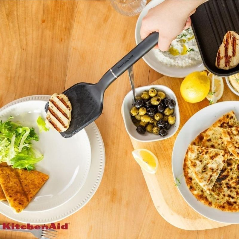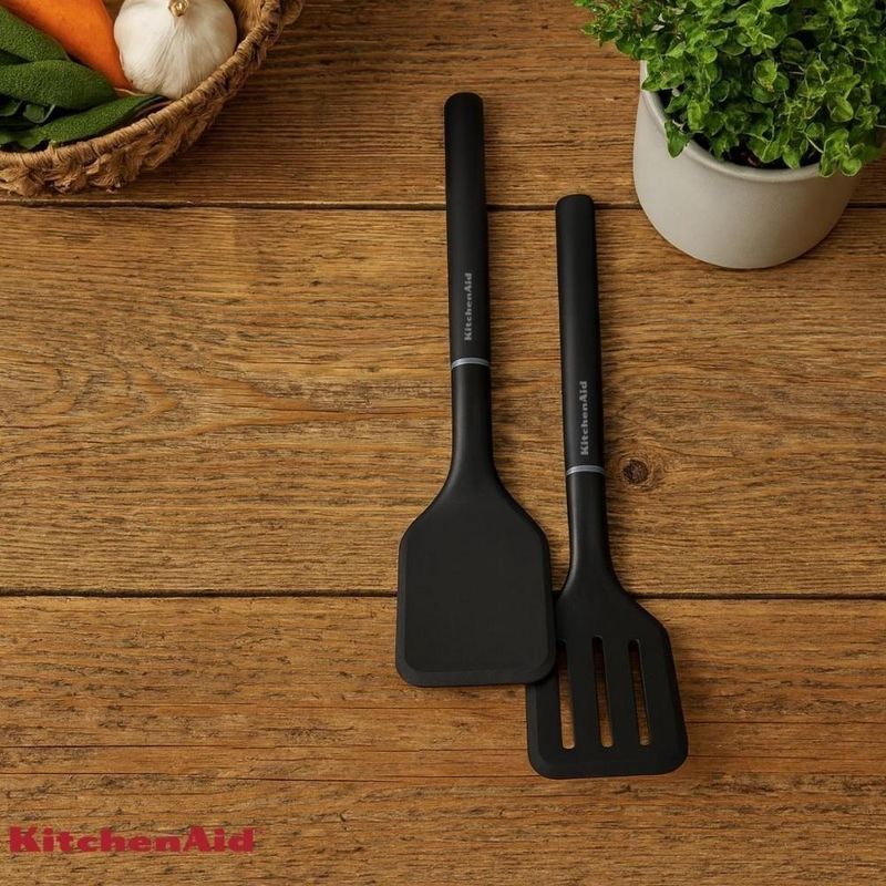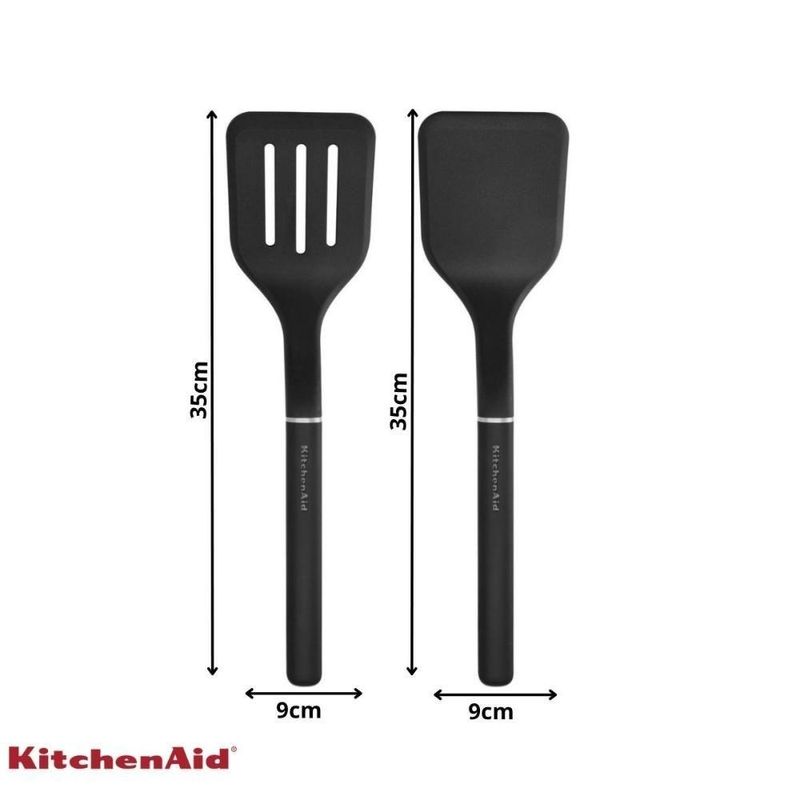 Jogo Espátula Turner E Perfurada Cozinha Preto KitchenaidO Jogo de Espátulas da Coleção Clássica KitchenAid combina praticidade, eficiência e design sofisticado, sendo essencial para o dia a dia e receitas especiais na cozinha.Espátula Perfurada: com cabeça extra larga e ranhuras longas e cônicas, garante drenagem suave de líquidos e liberação dos alimentos sem esforço, ideal para virar peixes, servir legumes, preparar bacon e muito mais.Espátula Sólida (Turner): possui cabeça larga em nylon durável que desliza facilmente sob os alimentos, perfeita para virar panquecas, ovos, hambúrgueres e outros pratos, sem arranhar superfícies delicadas, inclusive panelas antiaderentes.Produzidas em nylon resistente ao calor até 232°C, as espátulas são seguras para qualquer superfície e extremamente duráveis.Os cabos ergonômicos em ABS com acabamento fosco elegante, proporcionam pegada firme, confortável e higiênica, mesmo em usos prolongados.Duráveis, resistentes e laváveis na lava-louças, essas espátulas se tornam utensílios versáteis e indispensáveis para qualquer cozinheiro mantendo sua cozinha sempre elegante no padrão inconfundível KitchenAid.Material: Nylon e Plástico ABS livre de BPAMedidas Espátula Perfurada:Comprimento: 35cmLargura: 9cmPeso: 159gMedidas Espátula Turner:Comprimento: 35cmLargura: 9cmPeso: 140gMarca: KitchenAidCor: Preto OnixGarantia: 6 mesesSobre a KitchenAid:A KitchenAid é uma marca americana de eletrodomésticos e utensílios de cozinha das mais tradicionais do mundo. Há mais de 100 anos a KitchenAid vem oferecendo os melhores produtos para a sua cozinha. Seus produtos contam com design moderno e inovador e de altíssima qualidade. Suas batedeiras, liquidificadores, torradeiras e produtos de preparação, são vendidos em vários países e estão presentes em todos os continentes. Cor: Preto | Tipo de produto: Espátulas | Material: Nylon, plástico ABS | Marca: KitchenAid | Tipo da embalagem do vendedor: Com embalagem adicional | Altura da embalagem do vendedor: 37 cm | Largura da embalagem do vendedor: 15 cm | Comprimento da embalagem do vendedor: 10 cm | Peso da embalagem do vendedor: 360 g