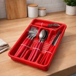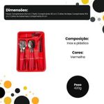 Jogo Faqueiro Inox 25 Peças Vermelho com Porta Talheres Organizador de GavetaEstrutura das lâminas em aço inoxidável para maior durabilidade.Cabos em polipropileno com design ergonômico na cor vermelha.Organizador de gaveta tipo gaveteiro incluso para separação dos utensílios.Conjunto completo com 24 talheres para servir até 6 pessoas simultaneamente.Facas com fio de corte eficiente para diferentes tipos de alimentos.O Jogo de Faqueiro Inox com Gaveteiro 25 Peças Vermelho é um conjunto completo para servir mesa e organizar a cozinha. Fabricado com lâminas de aço inoxidável e cabos de plástico resistente, o kit oferece durabilidade e conforto no manuseio.O produto acompanha um organizador de talheres plástico, facilitando o armazenamento dentro de gavetas ou sobre a bancada. Composto por facas, garfos, colheres de mesa e colheres de sobremesa, atende às necessidades diárias de até 6 pessoas, unindo funcionalidade técnica e padronização visual para o ambiente doméstico.ESPECIFICAÇÕES TÉCNICASMaterial das lâminas: Aço inoxidávelMaterial dos cabos: Plástico (Polipropileno)Quantidade de peças: 25 unidadesCor: VermelhaComprimento Facas: 22,2 cmComprimento Garfos: 20,1 cmComprimento Colheres de Mesa: 19,5 cmComprimento Colheres de Sobremesa: 15,0 cmPeso total aproximado: 420gPorta talheres incluso: SimCONTEÚDO DA EMBALAGEM6 Facas de mesa6 Garfos de mesa6 Colheres de mesa6 Colheres de sobremesa1 Organizador de talheres (Gaveteiro)PERGUNTAS FREQUENTESO jogo serve quantas pessoas? O conjunto é completo para servir até 6 pessoas.Os talheres podem ir à máquina de lavar louças? Sim, devido à composição em inox e polipropileno, podem ser higienizados em lava-louças.O organizador de talheres acompanha o produto? Sim, o gaveteiro plástico está incluso na embalagem.Qual o material do cabo? Os cabos são fabricados em plástico resistente na cor vermelha.